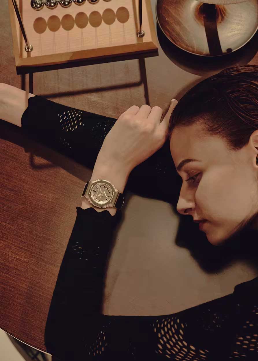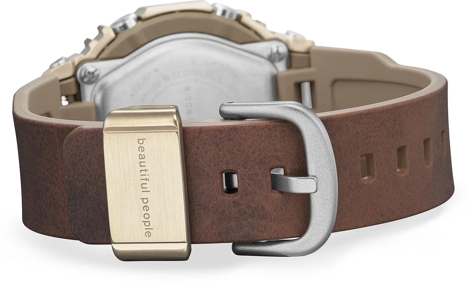Унисекс часы beautiful people x G-Shock. Модель создана совместно с японским брендом beautiful people, который был основан в 2006 году дизайнером Хиденори Кумакири. Ремешок и частично корпус выполнены из биопластика, который изготавливается из возобновляемых органических ресурсов. Противоударный корпус защищает механизм от ударов и вибрации. Двойная подcветка: циферблат и ЖК-дисплеи подсвечиваются светодиодом, благодаря наличию функции задержки, после отпускания кнопки освещение горит еще несколько секунд. Настраиваемое послесвечение 1,5 или 3сек. Цвет подсветки: белый. Необритовое светонакопительное покрытие обеспечивает длительное послесвечение в темноте даже после кратковременного нахождения на свету. 12-ти и 24-х часовой формат времени. Секундомер с двумя точностями показаний: 1/100с (до 1ч) и 1с (после 1ч) и временем измерения 24ч. Режимы измерения: прошедшее время, промежуточное время, время 1-го и 2-го места. Таймер обратного отсчета от 1с до 24ч. 5 будильников, ежечасный сигнал. Автоматический календарь (до 2099 года). Мировое время – 48 городов (31 часовой пояс), всемирное координированное время (UTC). Функции включения/отключения летнего времени, отключения/включения звука и перемещения стрелок для беспрепятственного просмотра информации на цифровом дисплее. Батарейка рассчитана на 3 года. Стальная задняя крышка крепится на 4-х винтах. Ремешок с классической застежкой.