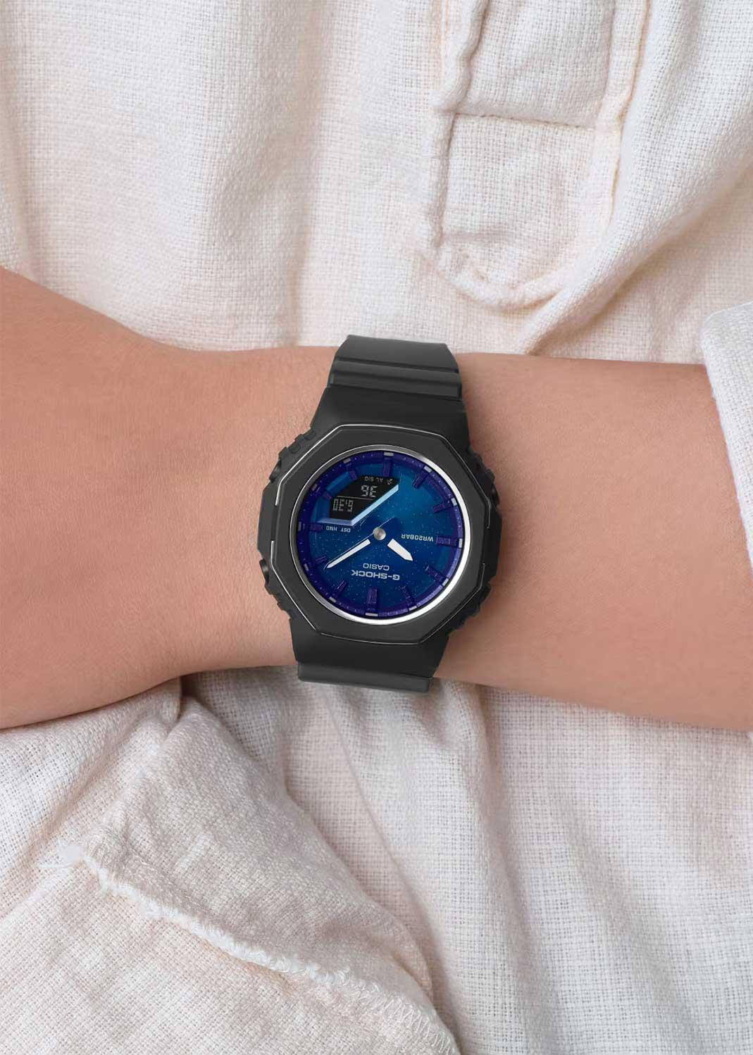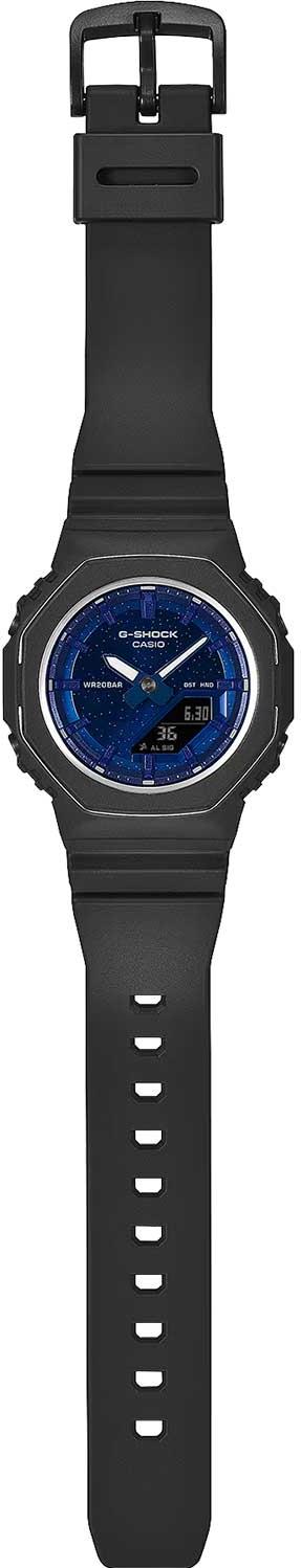 G-Shock. Женские часы. Циферблат вдохновлен натуральным камнем лазурит, который считается символом удачи. Корпус и ремешок выполнены из биопластика, который изготавливается из возобновляемых органических ресурсов. Противоударный корпус защищает механизм от ударов и вибрации. Двойная подcветка: циферблат и ЖК-дисплеи подсвечиваются светодиодом, благодаря наличию функции задержки, после отпускания кнопки освещение горит еще несколько секунд. Настраиваемое послесвечение 1,5 или 3сек. Цвет подсветки: белый. Необритовое светонакопительное покрытие обеспечивает длительное послесвечение в темноте даже после кратковременного нахождения на свету.
