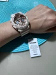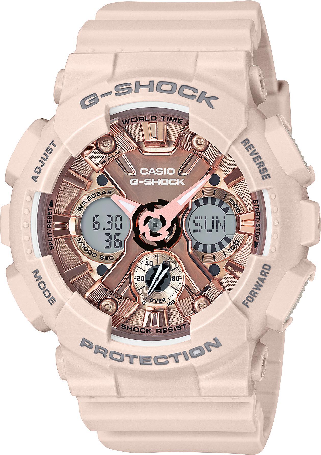Ударопрочные часы из серии G-Shock S-Series с измененным дизайном, металлизированного циферблата. Многофункциональный кварцевый механизм с двойной цифро-аналоговой индикацией. Секундомер с точностью 1/1000 сек. на 100 часов измерений.
