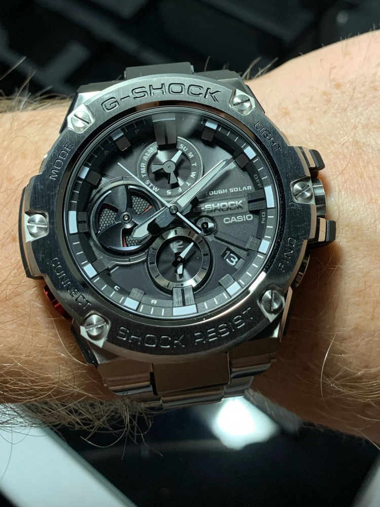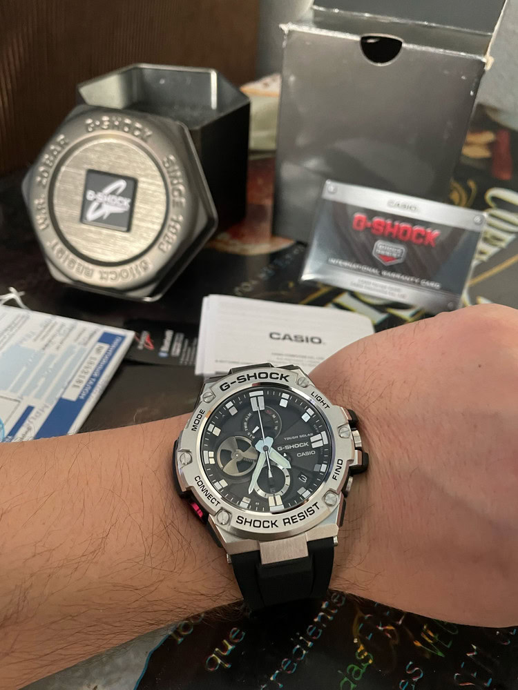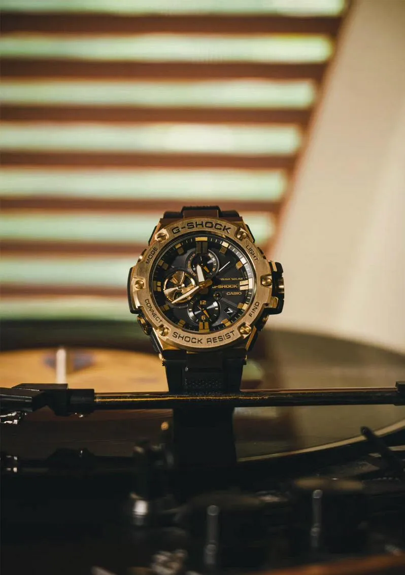 Мужские наручные часы Casio G-Shock GST-B100GB-1A9. Точный кварцевый механизм с аналого-цифровой индикацией. Корпус изготовлен из высококачественной нержавеющей стали 316L с высокими антикоррозийными свойствами. Светодиодная подсветка. На циферблате отображается текущее число, месяц и день недели. Ударопрочная конструкция часов защищает от ударов и вибрации. Солнечная батарейка. Солнечная подзаряжающаяся батарейка обеспечивает питание часов для работы. Функция Bluetooth позволяет удобно отображать все метрики с часов на экране смартфона, а также выводить на часы уведомления о входящих звонках, сообщениях и имейлах. Функция хронографа. Функция таймера. Таймеры обратного отсчета напомнят Вам о текущих или особенных событиях, издав звуковой сигнал в установленное время. Индикатор запаса хода. После настройки автоматический календарь всегда отображает точную дату. Отображение времени возможно в 12-часовом или 24-часовом формате. Полимерный ремешок. Натуральный полимерный материал является идеальным для изготовления ремешка благодаря своей чрезвычайной прочности и гибкости. Прочное, устойчивое к царапинам минеральное стекло защищает часы от повреждений. Часы являются водонепроницаемыми до 20 Бар. Цвет корпуса: Желтое золото. Цвет циферблата: Черный. Ширина (с заводной головкой): 58мм. Толщина: 14мм. Гарантия: 2 года. Другие наименования модели: GST-B100GB-1A9DR.