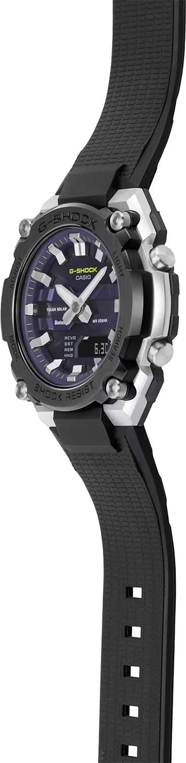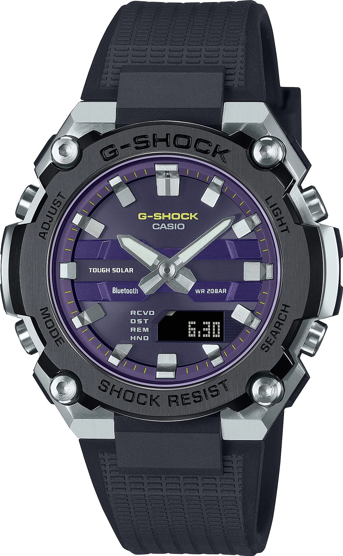 Мужские наручные часы Casio G-Shock GST-B600A-1A6. Питание от солнечной энергии Tough Solar — солнечные батарейки большой мощности, индикатор заряда батареи. Функция автоматического сохранения энергии. Время работы аккумулятора без подзарядки — приблизительно 7 месяцев, при включенной функции сохранения энергии — приблизительно 18 месяцев. Противоударный корпус защищает механизм от ударов и вибрации. Двойная подcветка: циферблат и ЖК-дисплеи подсвечиваются светодиодом. Выбираемая продолжительность подсветки (1,5 или 3 секунды), послесвечение. Цвет подсветки: белый. Необритовое светонакопительное покрытие обеспечивает длительное послесвечение в темноте даже после кратковременного нахождения на свету. 12-ти и 24-х часовой формат времени. Секундомер с точностью показаний 1сек и временем измерения 1ч. Секундомер с функцией SPLIT. Таймер обратного отсчета от 1сек до 1ч. 5 будильников, ежечасный сигнал. Полностью автоматический календарь (до 2099 года). Мировое время – 38 городов (38 часовых поясов), всемирное координированное время (UTC). Автоматический переход на зимнее и летнее время, возможность включения/отключения данной функции. Переключение между домашним и мировым временем. Беспроводная технология Bluetooth для синхронизации со смартфоном. При подключении к смартфону часы корректируют текущее время, напоминания, а также копируют настройки мирового времени более чем для 300 городов. Функции перемещения стрелок для беспрепятственного просмотра информации на дисплее, отключения/включения звука, поиска телефона. Отображение дней недели на шести языках. Смена отображения даты/месяца. Циферблат с метками в виде штрихов. Стальная задняя крышка крепится на 4-х винтах. Ремешок с классической застежкой.