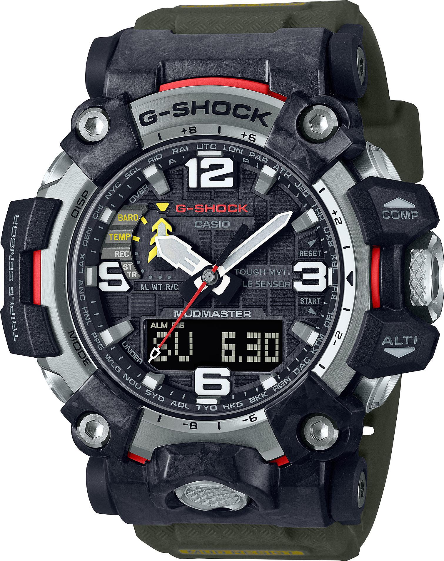 Компания CASIO представляет пополнение своей профессиональной коллекции Master of G - новую модель в рамках серии MUDMASTER, созданной для "покорителей Земли" и отличающуюся повышенной защитой от попадания грязи и пыли, - часы GWG-2000. Модель GWG-2000 унаследовала многое от своих предшественника - модели GWG1000. Новые технологии при создании корпуса на базе использования углеродного волокна позволили применить новую технологию строения корпуса "Carbon Core Guard". Использование кованого карбона и применение углеродно-усиленных полимеров позволило создать более компактный корпус в сравнении с предшественником. Сочетание новой структуры корпуса и кнопок с трубчето-поршневой системой, усиленной силиконовыми вставками, еще надежнее защищает механизм от попадания даже самой мелкодисперсной пыли. Защитно-фиксирующие внешние накладки выполнены из сверхпрочного кованого карбона и являются независимыми элементами корпуса, их внешний вид будет уникален для каждой модели и подчеркивает надежность часов серии MUDMASTER. Часы имеют кнопки и ремешок со специальным анти-скользящим покрытием для удобства использования в условиях сильного загрязнения, тройной датчик (альтиметр, барометр, компас, термометр), солнечный аккумулятор - и многое другое новинка унаследовала о предшественников. Тройной датчик не только помогает ориентироваться в пространстве и отслеживать изменения в окружающей среде, но и позволяет делать прогноз погоды.