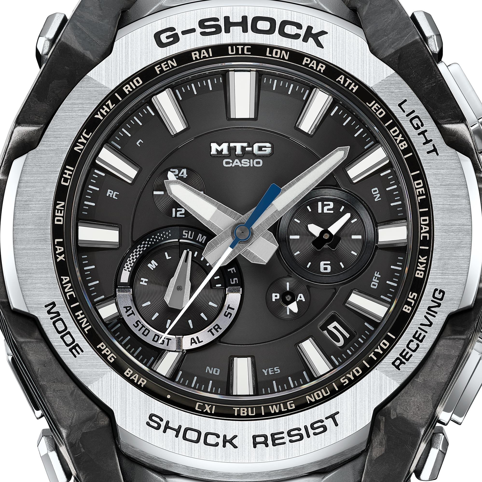 Часы G-Shock MTG-B4000 являют собой отличный пример синергии современного искусственного интеллекта и людей, творчески объединяющих свои возможности для создания продуктов, выходящих на новый уровень и раздвигающих привычные границы дизайна. Сложный объемный каркас часов выполнен из ламинированных листов карбона и стекловолокна, создавая необычный многослойный рисунок по краям корпуса. Стальные части безеля получили комбинированную обработку высочайшего уровня, совмещая зеркальные поверхности с изысканным текстурным сатинированием. Обновленный модуль часов надежно защищен карбоновым монококом по зарекомендовавшей себя технологии TRIPLE G RESIST от перегрузок, центробежной силы и различных, даже самых мощных вибраций. Присутствует и классическая для джишоков водозащита в 200 метров. Питаются часы от любого источника света благодаря встроенной солнечной батарее. Точность времени хода достигается гибридной системой: автоматической синхронизацией по 6-канальному радио-сигналу с атомными часами на разных континентах и через связь со смартфоном посредством Bluetooth.