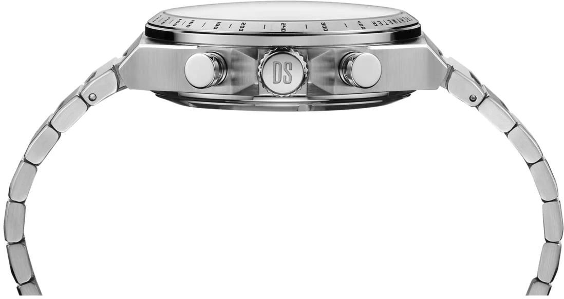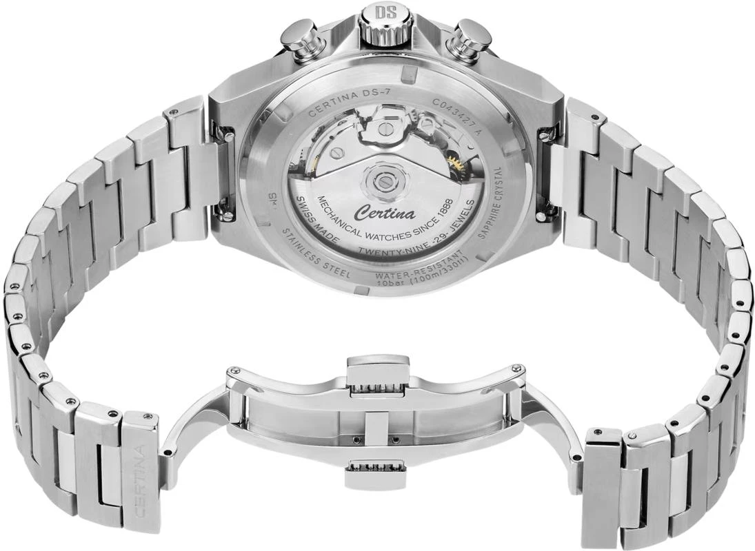 Мужские часы-хронограф Certina DS-7 Chrono Auto C043.427.11.041.00 — современные, динамичные и высокоточные. Корпус часов изготовлен из нержавеющей стали 316L. Сапфировое стекло с антибликовым покрытием. Окошко даты в положении 6 часов. Стрелки и метки покрыты люминесцентным покрытием Super-LumiNova. Стальной браслет на застёжке-бабочке с кнопками. Система быстрой смены ремешка. Тахиметрическая шкала на безеле. Класс водозащиты 100 метров (10 АТМ/bar): часы подходят для плавания и погружения на глубину 5-7 м (выдвигать заводную головку и нажимать кнопки, находясь в воде, нельзя).
