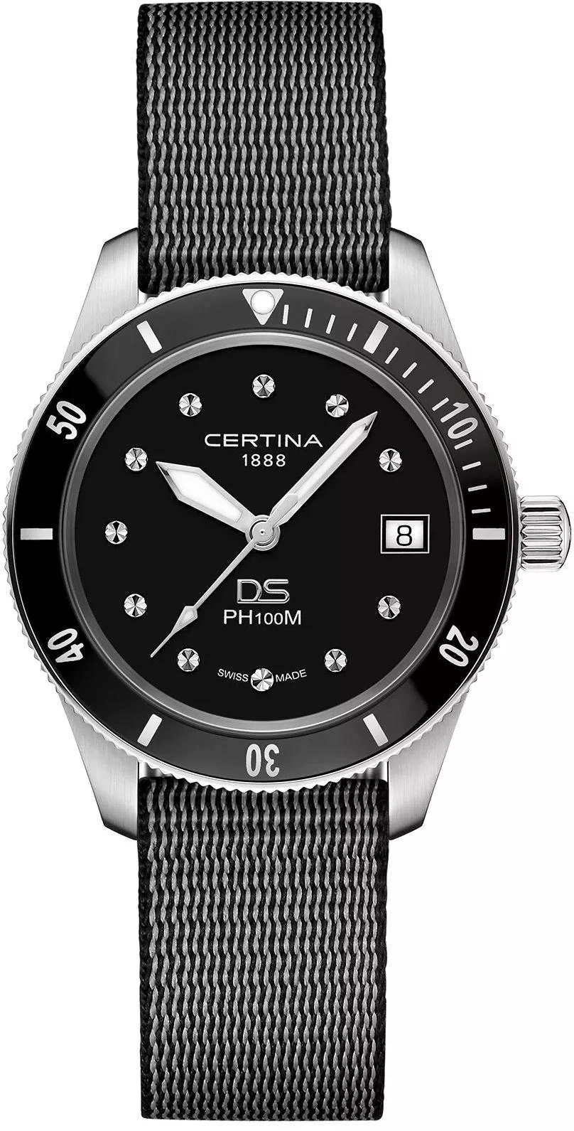 Certina Женские швейцарские часы DS PH100M C044.210.18.051.00. Точный кварцевый механизм с аналоговой индикацией. В отличие от механических часов, не требуют завода и работают от батареи, показывая отклонение всего несколько секунд в месяц. На стрелки и отметки нанесен светонакопительный состав, благодаря этому считывать информацию с циферблата возможно и в темноте. Текстильный ремешок. В отличие от кожаных ремешков, текстильный более устойчив к воздействию влаги и пота, не теряя своих свойств. Индикатор запаса хода. После настройки автоматический календарь всегда отображает точную дату. Корпус изготовлен из высококачественной нержавеющей стали 316L с высокими антикоррозийными свойствами. Сапфировое стекло. Искусственно изготовленное стекло с высокой прочностью и устойчивостью к царапинам. Часы являются водонепроницаемыми до 10 Бар. Цвет корпуса: Серебристый. Цвет корпуса: Черный. Цвет циферблата: Черный. Толщина: 10 мм. Гарантия: 2 года.