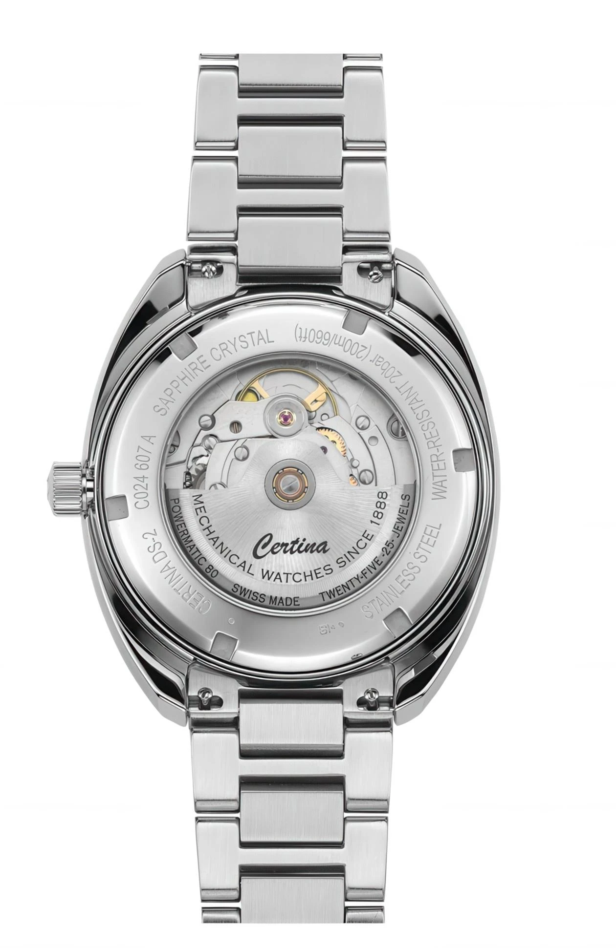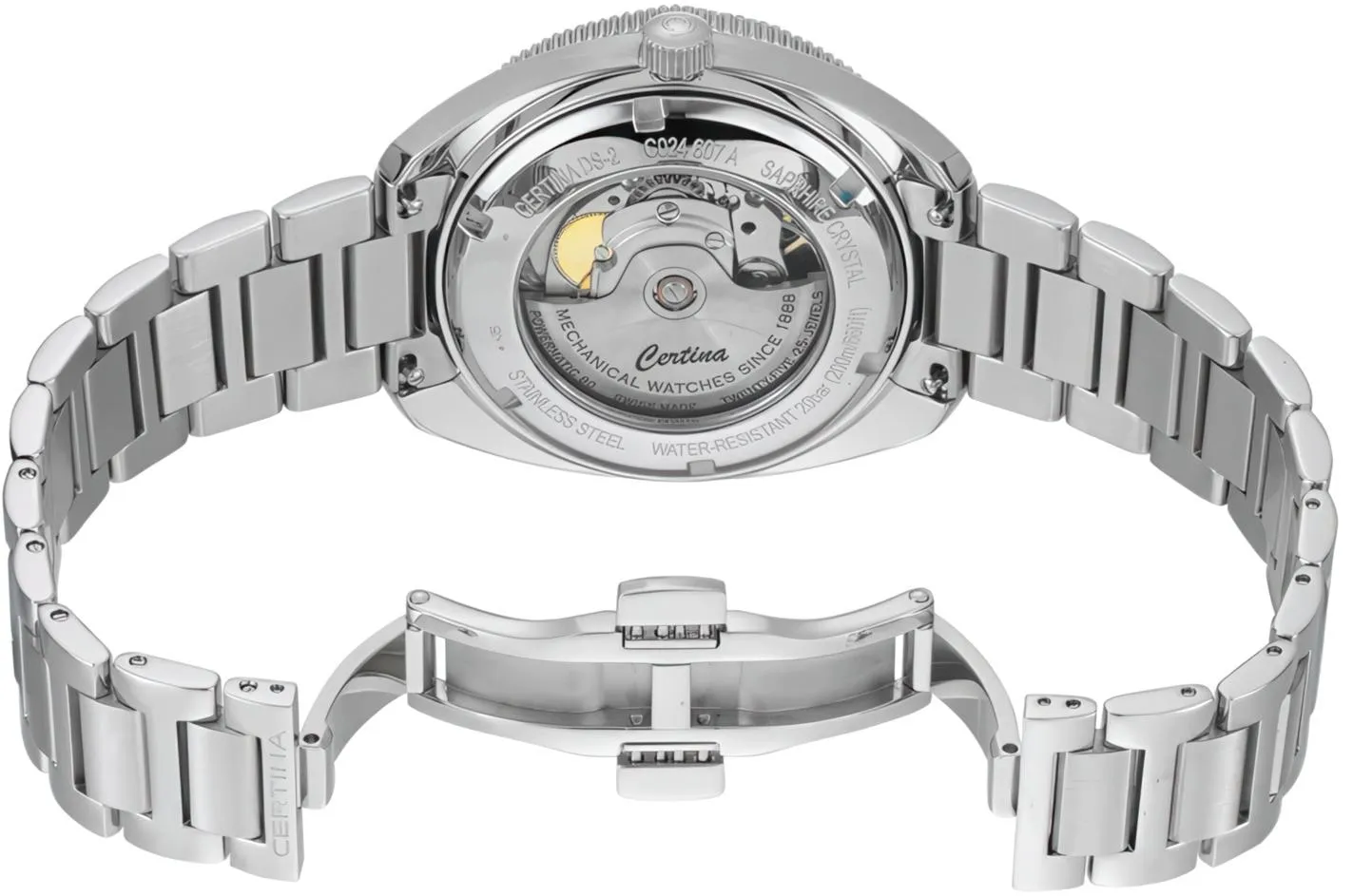 Certina Мужские швейцарские часы DS-2 C024.607.11.081.02. Механические с автоподзаводом. Пружина механизма заводится автоматически благодаря естественным движениям владельца в процессе ежедневной носки часов. На стрелки и отметки нанесен светонакопительный состав, благодаря этому считывать информацию с циферблата возможно и в темноте. Браслет из нержавеющей стали обладает высокой прочностью и износостойкостью, обеспечивая долговечность даже при активной эксплуатации. Материал устойчив к коррозии и сохраняет свой внешний вид надолго. Корпус изготовлен из высококачественной нержавеющей стали 316L с высокими антикоррозийными свойствами. Корпус изготовлен из высококачественного алюминиевого сплава. Сапфировое стекло. Искусственно изготовленное стекло с высокой прочностью и устойчивостью к царапинам. Часы являются водонепроницаемыми до 20 Бар. Цвет корпуса: Серебристый. Цвет циферблата: Черный. Высота (с ушками): 42 мм. Толщина: 12 мм. Гарантия: 2 года.