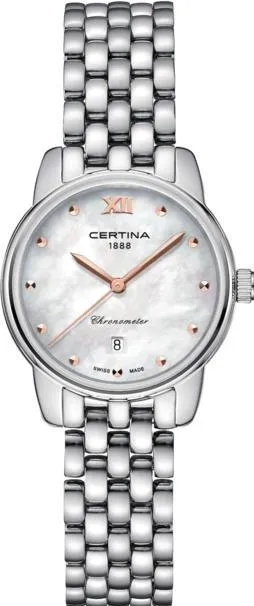Женские наручные часы Certina Женские часы C033.051.11.118.01. Точный кварцевый механизм с аналоговой индикацией. Корпус изготовлен из высококачественной нержавеющей стали 316L с высокими антикоррозийными свойствами. На циферблате отображается текущее число месяца. Браслет из нержавеющей стали. Сапфировое стекло. Искусственно изготовленное стекло с высокой прочностью и устойчивостью к царапинам. Часы являются водонепроницаемыми до 10 Бар. Цвет корпуса: Серебристый. Цвет циферблата: Серебристый. Ширина (с заводной головкой): 27мм. Толщина: 8мм. Гарантия: 2 года.