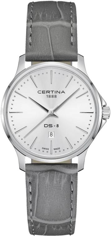 Certina Женские швейцарские часы DS-8 C045.010.16.031.00. Точный кварцевый механизм с аналоговой индикацией. В отличие от механических часов, не требуют завода и работают от батареи, показывая отклонение всего несколько секунд в месяц. Ремешок изготовлен из кожи. Гибкость такого ремешка позволяет точно регулировать посадку часов на руке. Индикатор запаса хода. Корпус изготовлен из высококачественной нержавеющей стали 316L с высокими антикоррозийными свойствами. Сапфировое стекло. Искусственно изготовленное стекло с высокой прочностью и устойчивостью к царапинам. Часы являются водонепроницаемыми до 10 Бар. Цвет корпуса: Серебристый. Цвет циферблата: Серебристый. Толщина: 8 мм. Гарантия: 2 года.
