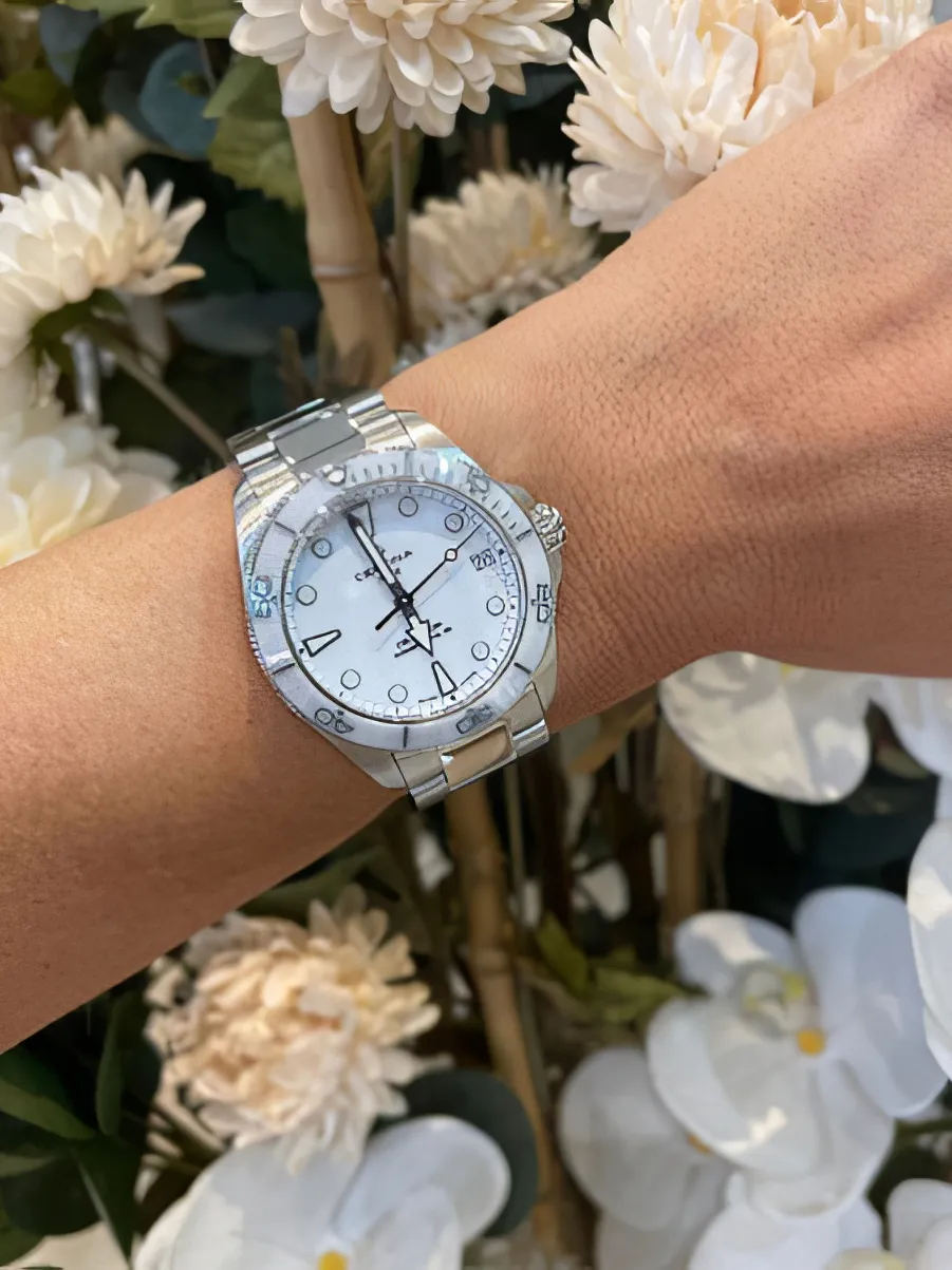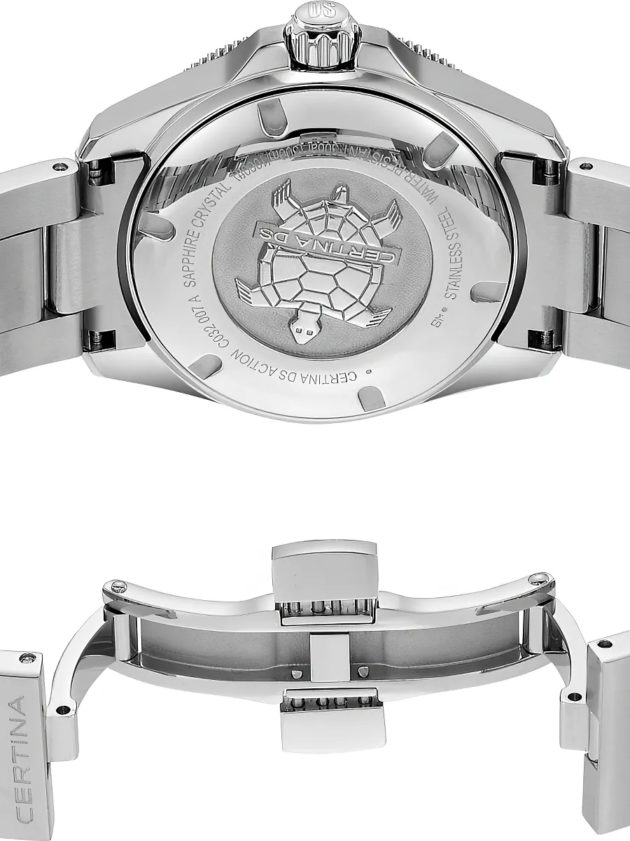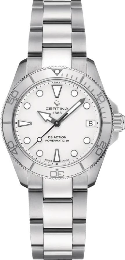 Женские наручные часы Certina DS Action C032.007.11.011.00. Механические с автоподзаводом. Пружина механизма заводится автоматически благодаря естественным движениям владельца в процессе ежедневной носки часов. Корпус изготовлен из высококачественной нержавеющей стали 316L с высокими антикоррозийными свойствами. На стрелки и отметки нанесен светонакопительный состав, благодаря этому считывать информацию с циферблата возможно и в темноте. На циферблате отображается текущее число месяца. Браслет из нержавеющей стали. Сапфировое стекло. Искусственно изготовленное стекло с высокой прочностью и устойчивостью к царапинам. Часы являются водонепроницаемыми до 30 Бар. Цвет корпуса: Серебристый. Цвет циферблата: Серебристый. Ширина (с заводной головкой): 35мм. Толщина: 9мм. Гарантия: 2 года.