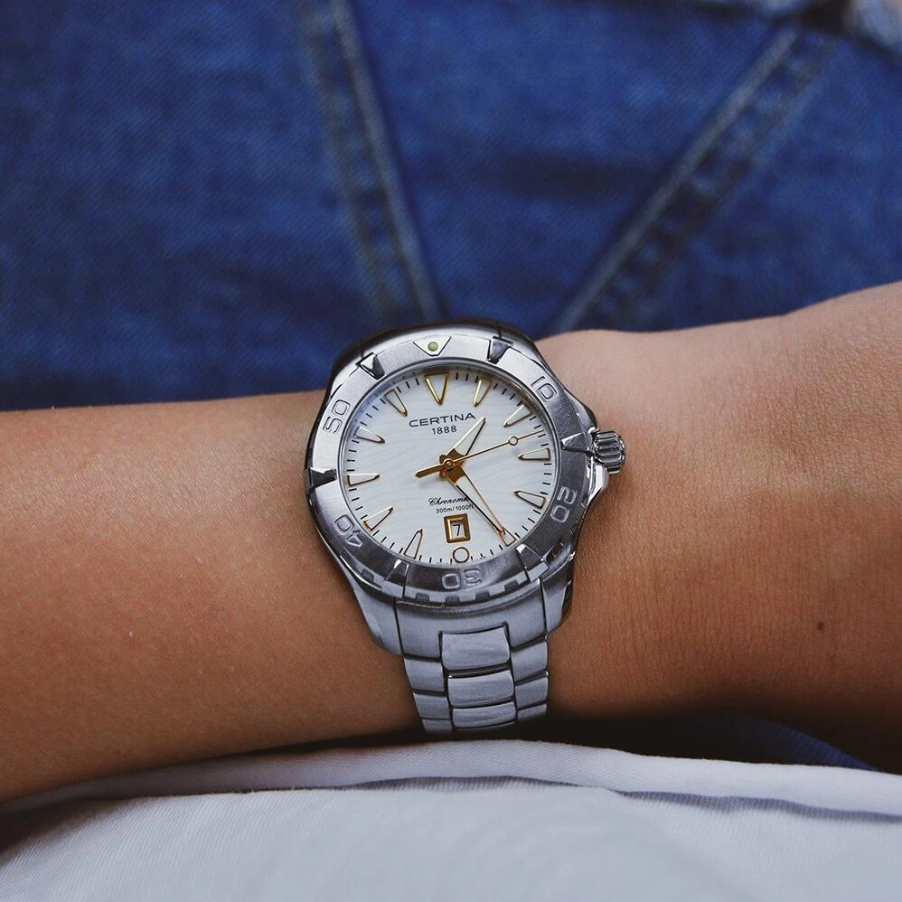 Женские наручные часы Certina DS Action C032.251.11.011.01. Точный кварцевый механизм с аналоговой индикацией. Корпус изготовлен из высококачественной нержавеющей стали 316L с высокими антикоррозийными свойствами. На стрелки и отметки нанесен светонакопительный состав, благодаря этому считывать информацию с циферблата возможно и в темноте. На циферблате отображается текущее число месяца. Браслет из нержавеющей стали. Сапфировое стекло. Искусственно изготовленное стекло с высокой прочностью и устойчивостью к царапинам. Часы являются водонепроницаемыми до 30 Бар. Цвет корпуса: Серебристый. Цвет циферблата: Белый. Ширина (с заводной головкой): 34мм. Толщина: 10мм. Гарантия: 2 года.