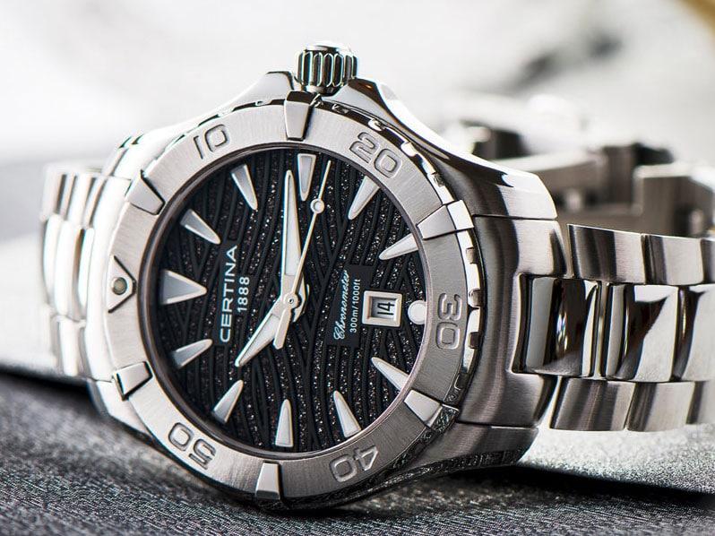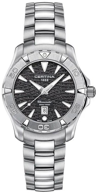 Женские наручные часы Certina DS Action C032.251.11.051.09. Точный кварцевый механизм с аналоговой индикацией. Корпус изготовлен из высококачественной нержавеющей стали 316L с высокими антикоррозийными свойствами. На стрелки и отметки нанесен светонакопительный состав, благодаря этому считывать информацию с циферблата возможно и в темноте. На циферблате отображается текущее число месяца. Браслет из нержавеющей стали. Сапфировое стекло. Искусственно изготовленное стекло с высокой прочностью и устойчивостью к царапинам. Часы являются водонепроницаемыми до 30 Бар. Цвет корпуса: Серебристый. Цвет циферблата: Черный. Ширина (с заводной головкой): 34мм. Толщина: 10мм. Гарантия: 2 года.