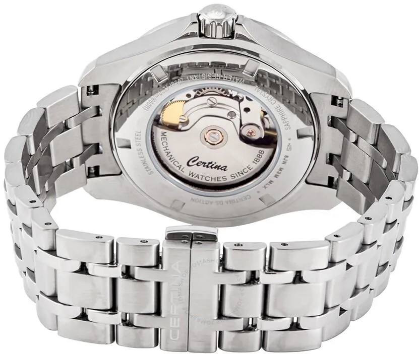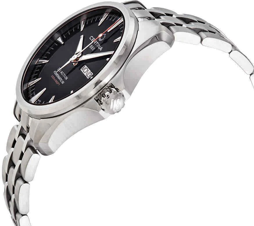 Мужские наручные часы Certina DS Action C032.430.11.051.00. Механические с ручным подзаводом. Корпус изготовлен из высококачественной нержавеющей стали 316L с высокими антикоррозийными свойствами. На стрелки и отметки нанесен светонакопительный состав, благодаря этому считывать информацию с циферблата возможно и в темноте. На циферблате отображается текущее число месяца и день недели. Браслет из нержавеющей стали. Сапфировое стекло. Искусственно изготовленное стекло с высокой прочностью и устойчивостью к царапинам. Часы являются водонепроницаемыми до 20 Бар. Цвет корпуса: Серебристый. Цвет циферблата: Черный. Ширина (с заводной головкой): 41мм. Толщина: 10мм. Гарантия: 2 года.