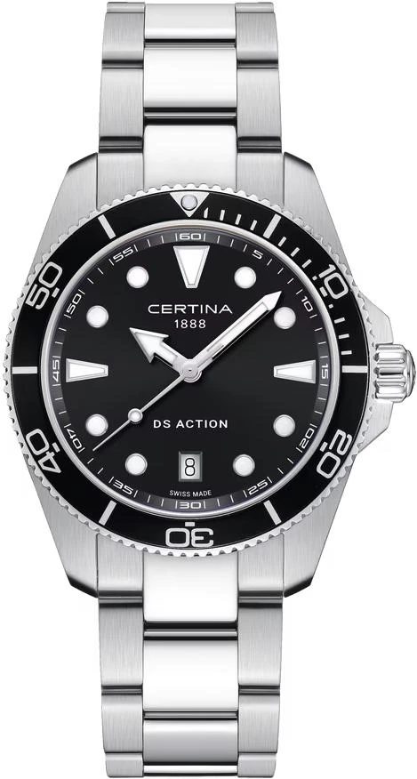 Certina Мужские швейцарские часы DS Action C048.410.11.051.00. Точный кварцевый механизм с аналоговой индикацией. В отличие от механических часов, не требуют завода и работают от батареи, показывая отклонение всего несколько секунд в месяц. На стрелки и отметки нанесен светонакопительный состав, благодаря этому считывать информацию с циферблата возможно и в темноте. Браслет из нержавеющей стали обладает высокой прочностью и износостойкостью, обеспечивая долговечность даже при активной эксплуатации. Материал устойчив к коррозии и сохраняет свой внешний вид надолго. После настройки автоматический календарь всегда отображает точную дату. Корпус изготовлен из высококачественной нержавеющей стали 316L с высокими антикоррозийными свойствами. Сапфировое стекло. Искусственно изготовленное стекло с высокой прочностью и устойчивостью к царапинам. Часы являются водонепроницаемыми до 30 Бар. Цвет корпуса: Серебристый. Цвет корпуса: Черный. Цвет циферблата: Черный. Толщина: 12 мм. Гарантия: 2 года.