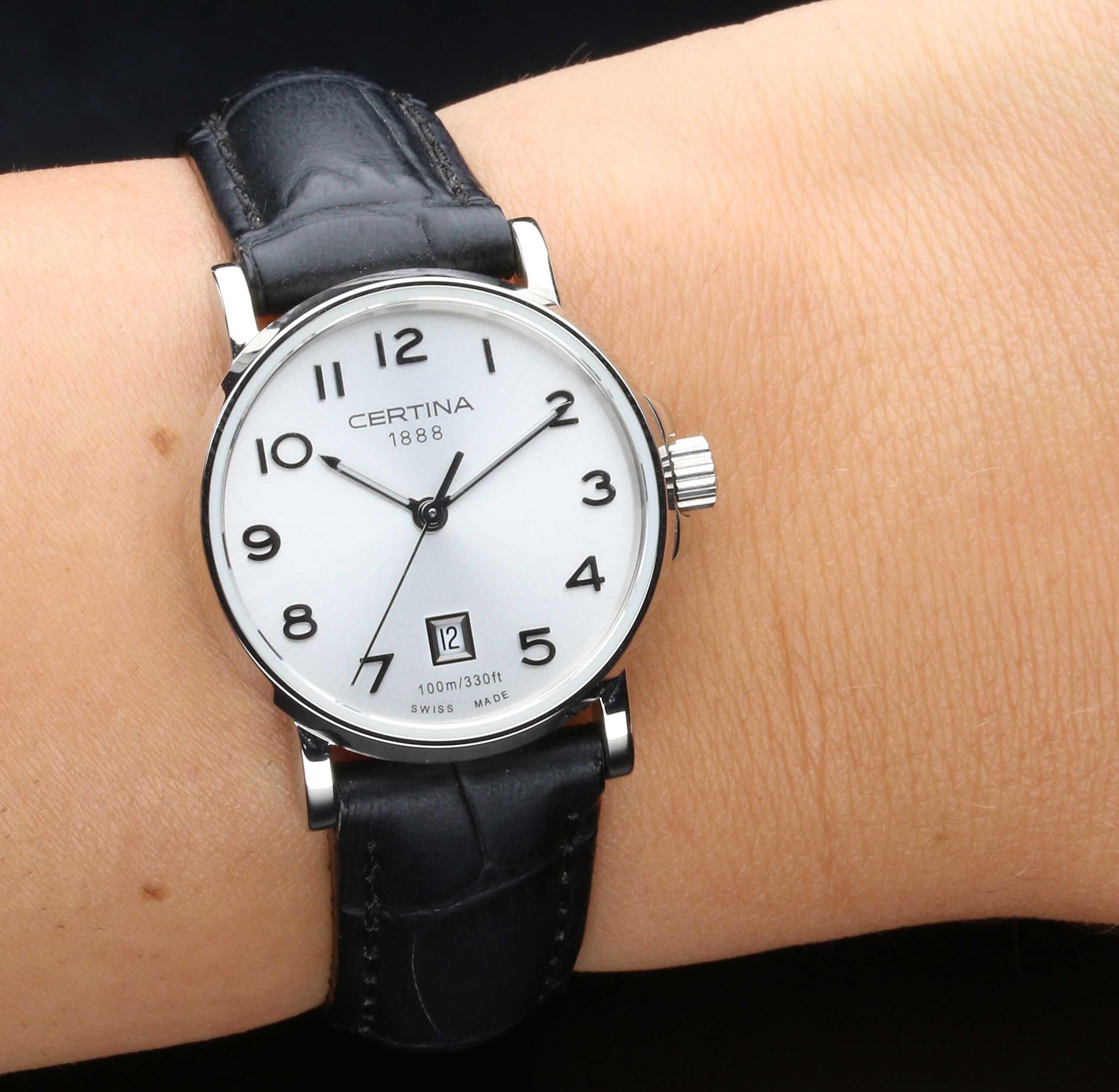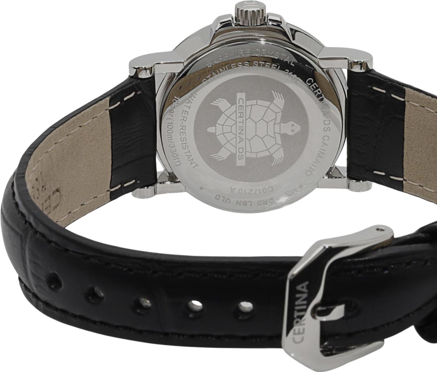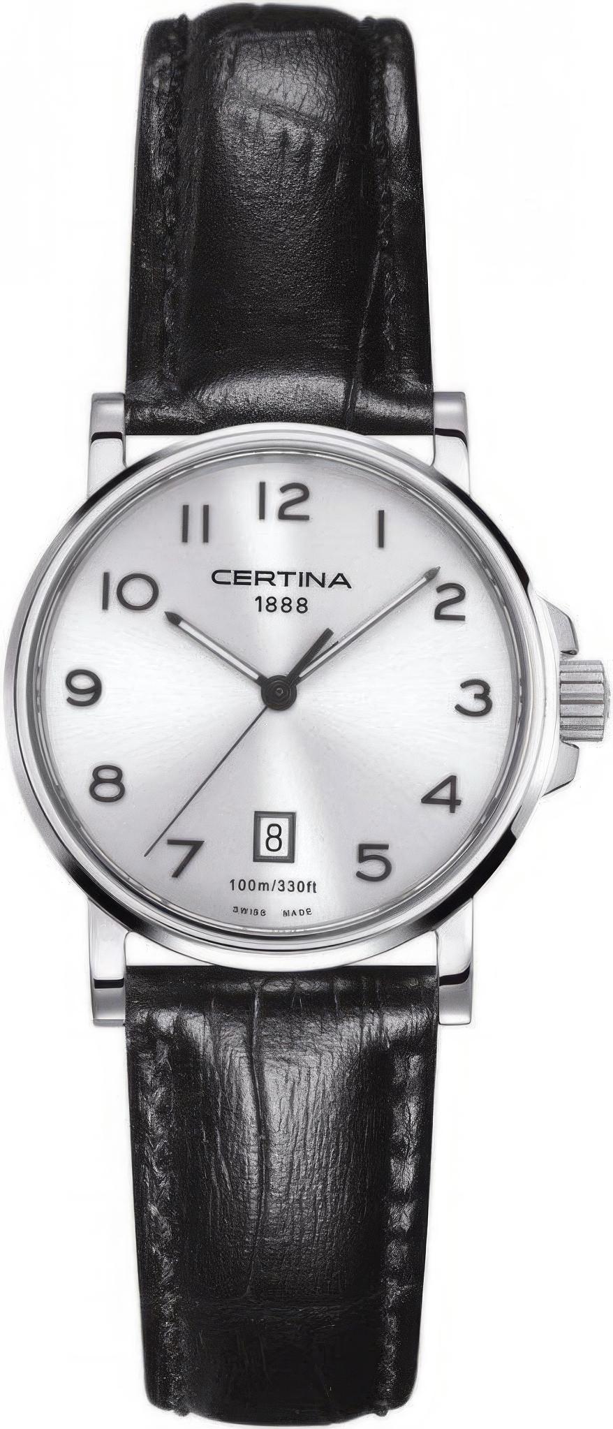 Швейцарские кварцевые наручные часы Certina C017.210.16.032.00 на ремешке из кожи — элегантная женская модель, идеально подходящая для официальных или офисных нарядов. Точность хода обеспечивает кварцевый механизм ETA калибра F03.111. Круглый стальной корпус, фиксированный серебристый безель из нержавеющей стали, черный циферблат со светящимися стрелками и часовыми метками с арабскими цифрами, узкие заостренные прямоугольные стрелки в стиле Baton с люминесцентным покрытием, которое светится в темноте после непродолжительной зарядки на свету. Окошко даты находится в положении 6 часов, рифленая заводная головка, удобный кожаный ремешок. Класс водозащиты 100 метров (10 АТМ/bar): часы подходят для плавания и погружения на глубину 5-7 м (выдвигать заводную головку и нажимать кнопки, находясь в воде, нельзя). Классические черты этих часов придутся по вкусу любительницам оригинальных аксессуаров.