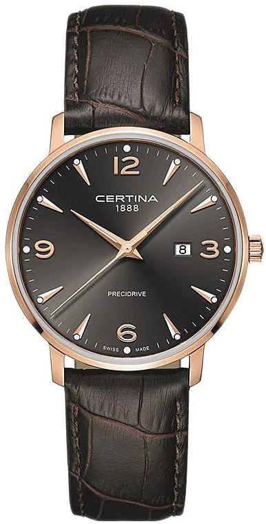 <b>Мужские наручные часы Certina DS Caimano C035.410.36.087.00.</b> Точный кварцевый механизм с аналоговой индикацией. Корпус изготовлен из высококачественной нержавеющей стали 316L с высокими антикоррозийными свойствами. На стрелки и отметки нанесен светонакопительный состав, благодаря этому считывать информацию с циферблата возможно и в темноте. На циферблате отображается текущее число месяца. Ремешок изготовлен из кожи. Сапфировое стекло. Искусственно изготовленное стекло с высокой прочностью и устойчивостью к царапинам. Часы являются водонепроницаемыми до 10 Бар. Цвет корпуса: Розовое золото. Цвет циферблата: Черный. Гарантия: 2 года.