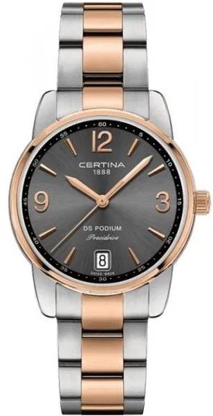 <b>Женские наручные часы Certina DS Podium C034.210.22.087.00.</b> Точный кварцевый механизм с аналоговой индикацией. Корпус изготовлен из высококачественной нержавеющей стали 316L с высокими антикоррозийными свойствами. На циферблате отображается текущее число месяца. Браслет из нержавеющей стали. Сапфировое стекло. Искусственно изготовленное стекло с высокой прочностью и устойчивостью к царапинам. Часы являются водонепроницаемыми до 10 Бар. Цвет корпуса: Серебристый. Цвет циферблата: Серый. Гарантия: 2 года.