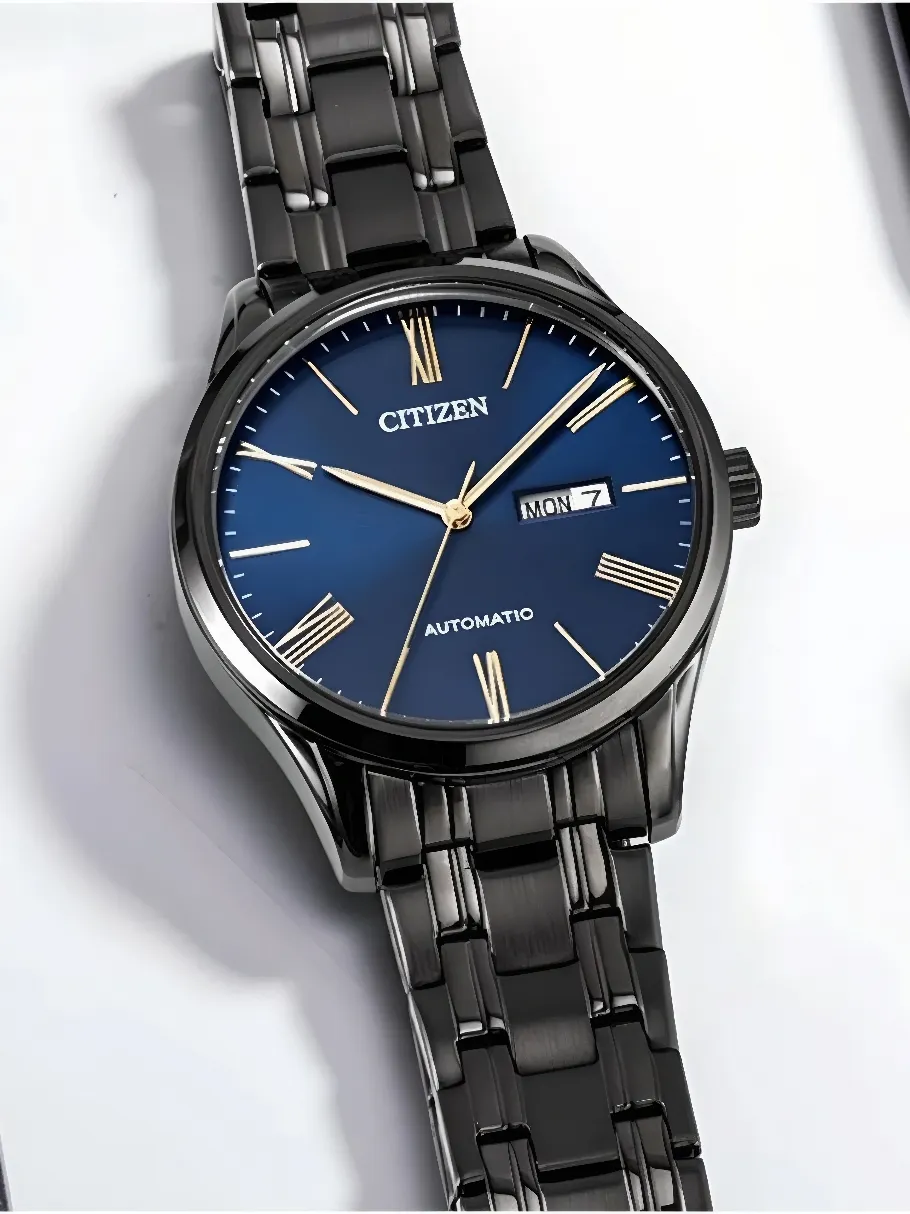 Мужские наручные часы Citizen Automatic NH8365-86M. Механические с автоподзаводом. Пружина механизма заводится автоматически благодаря естественным движениям владельца в процессе ежедневной носки часов. Браслет из нержавеющей стали. Браслет из нержавеющей стали. Прочное, устойчивое к царапинам минеральное стекло защищает часы от повреждений. На циферблате отображается текущее число месяца и день недели. Часы являются водонепроницаемыми до 5 Бар. Цвет циферблата: Черный. Цвет корпуса: Синий. Толщина: 11 мм. Гарантия: 2 года.