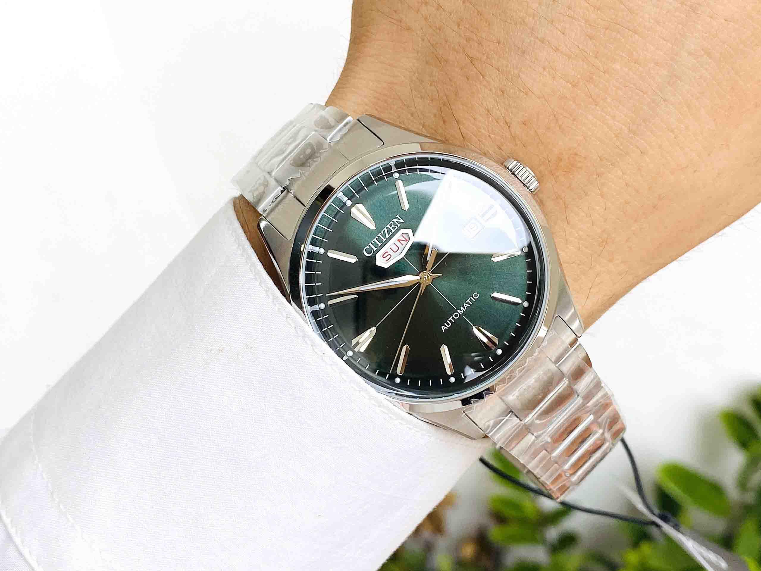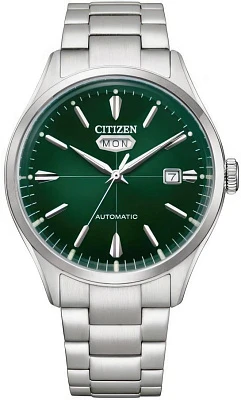 Мужские наручные часы Citizen Automatic NH8391-51X. Механические с ручным подзаводом. Браслет из нержавеющей стали. Браслет из нержавеющей стали. Прочное, устойчивое к царапинам минеральное стекло защищает часы от повреждений. На циферблате отображается текущее число месяца и день недели. Часы являются водонепроницаемыми до 5 Бар. Цвет циферблата: Серебристый. Цвет корпуса: Зеленый. На стрелки и отметки нанесен светонакопительный состав, благодаря этому считывать информацию с циферблата возможно и в темноте. Толщина: 12 мм. Гарантия: 2 года.