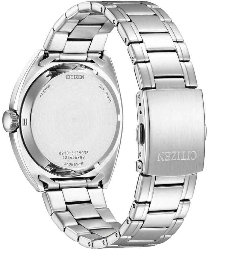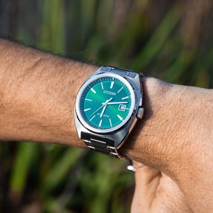 Мужские наручные часы Citizen Automatic NJ0101-78X. Механические с ручным подзаводом. Браслет из нержавеющей стали. Браслет из нержавеющей стали. Прочное, устойчивое к царапинам минеральное стекло защищает часы от повреждений. На циферблате отображается текущее число месяца. Часы являются водонепроницаемыми до 5 Бар. Цвет циферблата: Серебристый. Цвет корпуса: Зеленый. Толщина: 12 мм. Гарантия: 2 года.