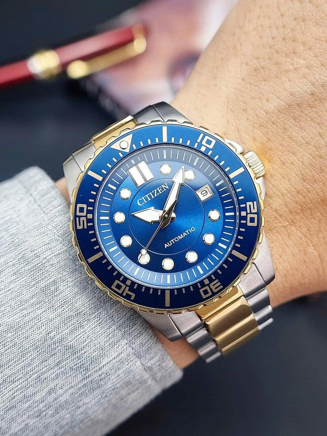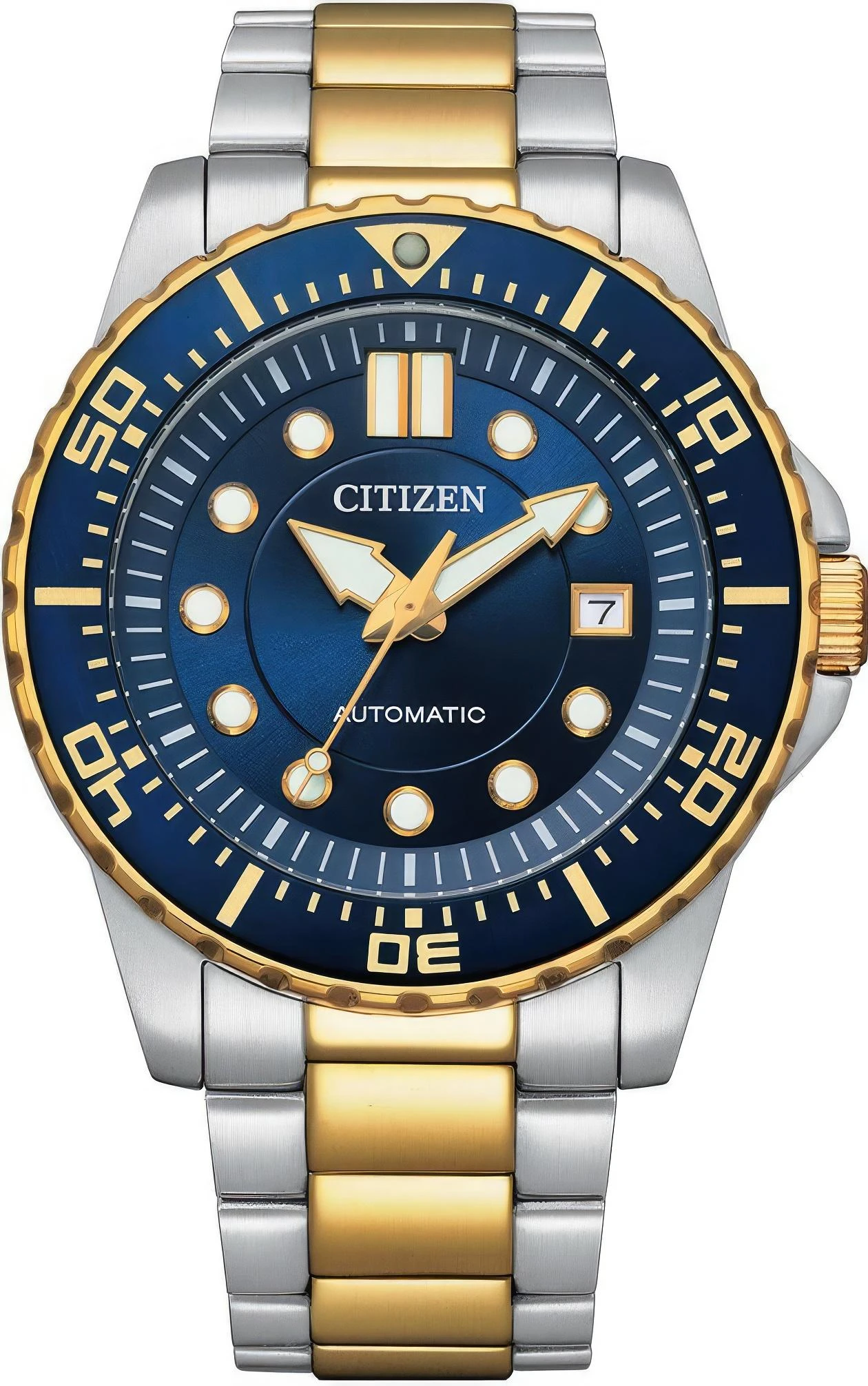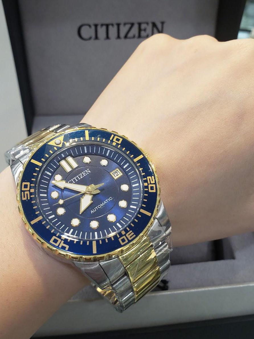 Мужские наручные часы Citizen Automatic NJ0174-82L. Механические с ручным подзаводом. Браслет из нержавеющей стали. Браслет из нержавеющей стали. Прочное, устойчивое к царапинам минеральное стекло защищает часы от повреждений. На циферблате отображается текущее число месяца. Часы являются водонепроницаемыми до 10 Бар. Цвет циферблата: Синий. Цвет циферблата: Желтое золото. Цвет корпуса: Синий. На стрелки и отметки нанесен светонакопительный состав, благодаря этому считывать информацию с циферблата возможно и в темноте. Толщина: 12 мм. Гарантия: 2 года.
