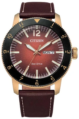 Мужские наручные часы Citizen Eco Drive AW0079-13X. Точный кварцевый механизм с аналоговой индикацией. Корпус изготовлен из высококачественной нержавеющей стали 316L с высокими антикоррозийными свойствами. На стрелки и отметки нанесен светонакопительный состав, благодаря этому считывать информацию с циферблата возможно и в темноте. На циферблате отображается текущее число месяца и день недели. Солнечная батарейка. Солнечная подзаряжающаяся батарейка обеспечивает питание часов для работы. Ремешок изготовлен из кожи. Прочное, устойчивое к царапинам минеральное стекло защищает часы от повреждений. Часы являются водонепроницаемыми до 10 Бар. Цвет корпуса: Черный. Цвет циферблата: Коричневый. Ширина (с заводной головкой): 43мм. Толщина: 12мм. Гарантия: 2 года.