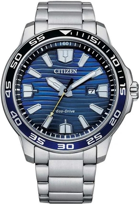 Ярковыраженный спортивный дизайн. Круглый корпус и литой браслет из нерж. стали. Минеральное стекло. Водозащита 10 бар. Кварцевый механизм Eco-Drive.