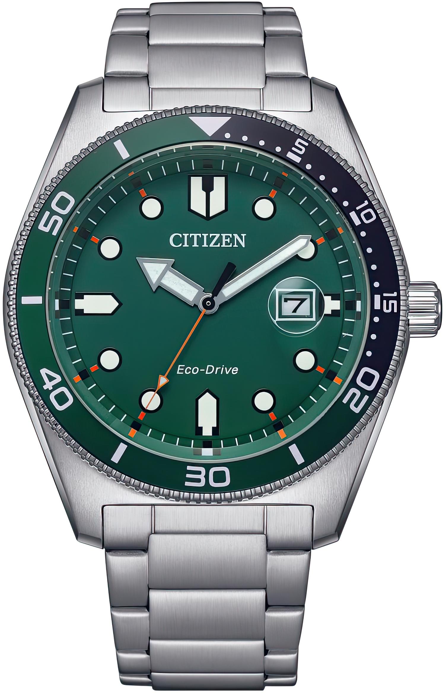 Мужские наручные часы Citizen Eco Drive AW1768-80X. Точный кварцевый механизм с аналоговой индикацией. Браслет из нержавеющей стали. Солнечная батарейка. Солнечная подзаряжающаяся батарейка обеспечивает питание часов для работы. Браслет из нержавеющей стали. Прочное, устойчивое к царапинам минеральное стекло защищает часы от повреждений. На циферблате отображается текущее число месяца. Часы являются водонепроницаемыми до 10 Бар. Цвет циферблата: Зеленый. Цвет циферблата: Серебристый. Цвет циферблата: Черный. Цвет корпуса: Зеленый. На стрелки и отметки нанесен светонакопительный состав, благодаря этому считывать информацию с циферблата возможно и в темноте. Толщина: 12 мм. Гарантия: 2 года.