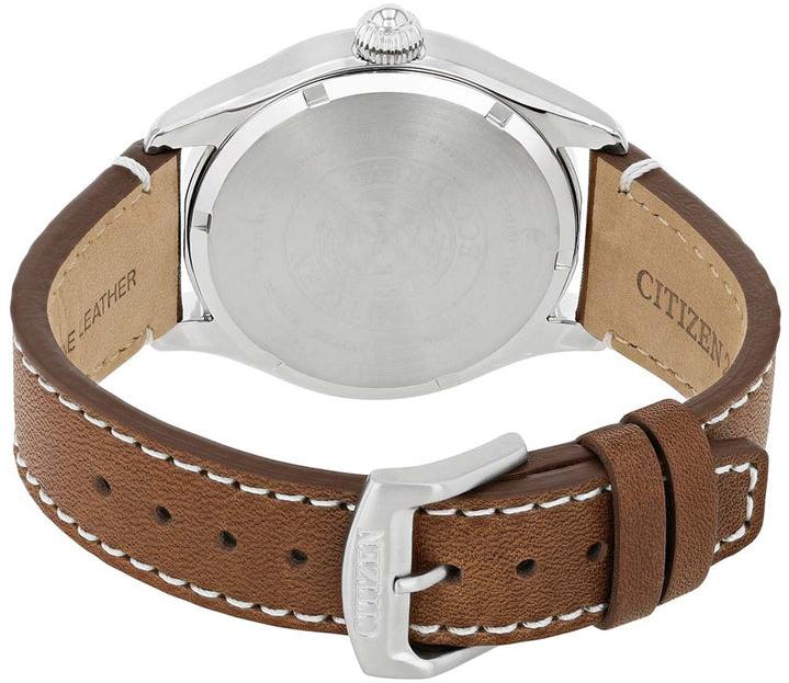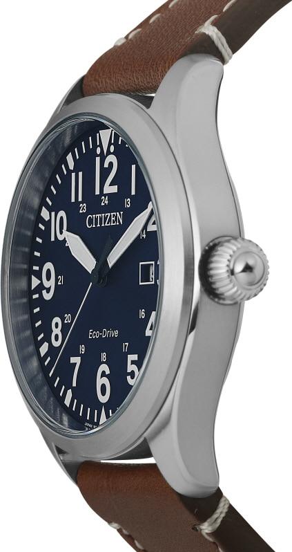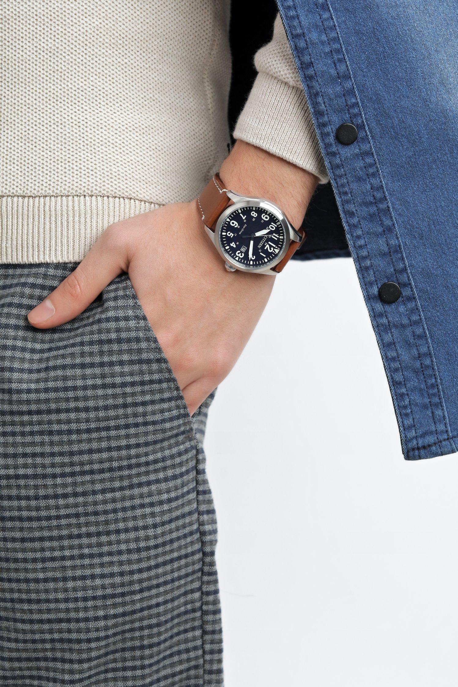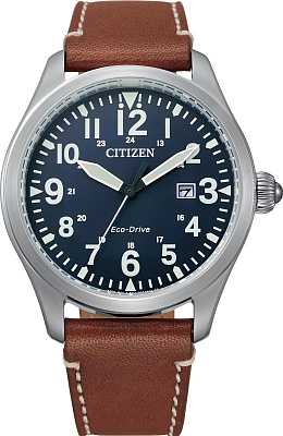 Мужские наручные часы Citizen Eco Drive BM6838-33L. Точный кварцевый механизм с аналоговой индикацией. Ремешок изготовлен из кожи. Солнечная батарейка. Солнечная подзаряжающаяся батарейка обеспечивает питание часов для работы. Браслет из нержавеющей стали. Прочное, устойчивое к царапинам минеральное стекло защищает часы от повреждений. На циферблате отображается текущее число месяца. Часы являются водонепроницаемыми до 10 Бар. Цвет циферблата: Серебристый. Цвет корпуса: Синий. На стрелки и отметки нанесен светонакопительный состав, благодаря этому считывать информацию с циферблата возможно и в темноте. Толщина: 8 мм. Гарантия: 2 года.