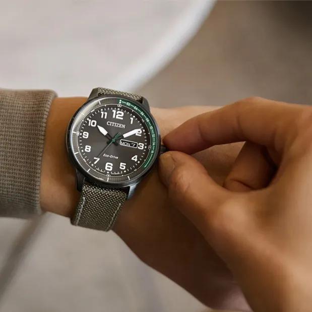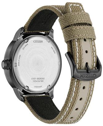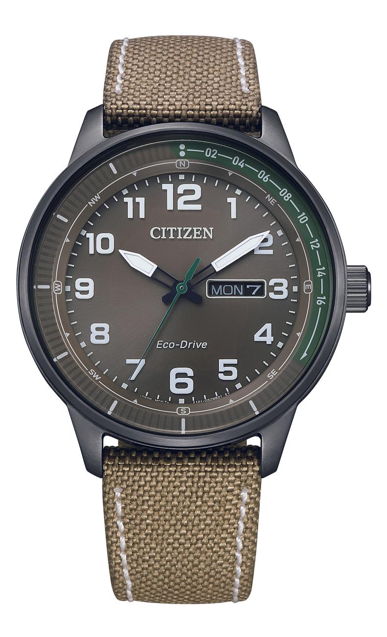 Мужские наручные часы Citizen Eco Drive BM8595-16H. Точный кварцевый механизм с аналоговой индикацией. Ремешок изготовлен из кожи. Текстильный ремешок. Встроенный цифровой компас определяет северный магнитный полюс. Солнечная батарейка. Солнечная подзаряжающаяся батарейка обеспечивает питание часов для работы. Браслет из нержавеющей стали. Прочное, устойчивое к царапинам минеральное стекло защищает часы от повреждений. На циферблате отображается текущее число месяца и день недели. Часы являются водонепроницаемыми до 10 Бар. Цвет циферблата: Серый. Цвет корпуса: Коричневый. На стрелки и отметки нанесен светонакопительный состав, благодаря этому считывать информацию с циферблата возможно и в темноте. Толщина: 11 мм. Гарантия: 2 года.