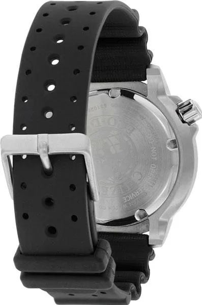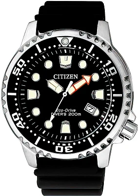 Внушительные мужские часы Promaster для подводного плаванья. Стальной корпус с поворотным безелем, минеральное стекло. Повышенная водостойкость в 200 метров в соответствии со стандартом ISO 6425. Кварцевый механизм с системой Eco-Drive.
