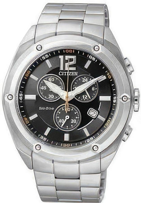 Кварцевый хронограф с окошком даты. Калибр B61* оснащенный системой питания и подзарядки от солнечного света ECO-DRIVE. • Система ECO-DRIVE - патентованная технология CITIZEN заключающаяся в размещении фотоэлементов скрытых под циферблатом и постоянно подзаряжающих аккумулятор часов. Продолжительность работы после полной зарядки аккумулятора при последующем хранении в темноте - 7 месяцев. • Система предупреждения о низком уровне заряда аккумулятора за 72 часа до критического уровня. • Центральная стрелка для отсчета секунд. Счетчик накопитель на 60 минут в положении 12 часов. • Смещенная секундная стрелка в положении 6 часов. • Окошко даты. • Стрелочный указатель времени суток - 24-часовая шкала в положении 9 часов. • Точность хода не хуже -/+15 сек./в месяц. • Минеральное стекло устойчивое к возникновению царапин. • Корпус из высококачественного стального сплава 316L с высокими антикоррозийными свойствами. • Водозащита до 10 АТМ. • Литой браслет из нержавеющей стали. • Надежный браслетный замок с тройным сгибом.