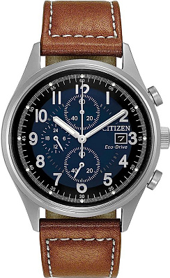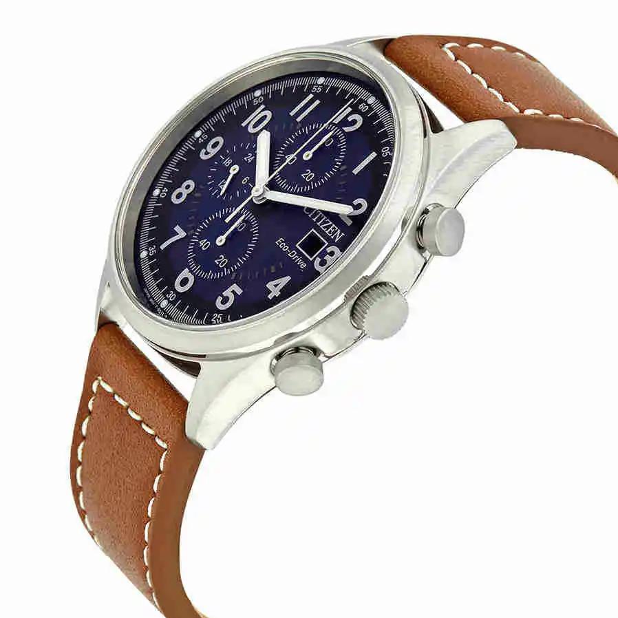 Мужские наручные часы Citizen Eco Drive CA0621-05L. Точный кварцевый механизм с аналоговой индикацией. Ремешок изготовлен из кожи. Функция хронографа. Солнечная батарейка. Солнечная подзаряжающаяся батарейка обеспечивает питание часов для работы. Отображение времени возможно в 12-часовом или 24-часовом формате. Браслет из нержавеющей стали. Прочное, устойчивое к царапинам минеральное стекло защищает часы от повреждений. На циферблате отображается текущее число месяца. Часы являются водонепроницаемыми до 10 Бар. Цвет циферблата: Серебристый. Цвет корпуса: Синий. На стрелки и отметки нанесен светонакопительный состав, благодаря этому считывать информацию с циферблата возможно и в темноте. Толщина: 12 мм. Гарантия: 2 года.