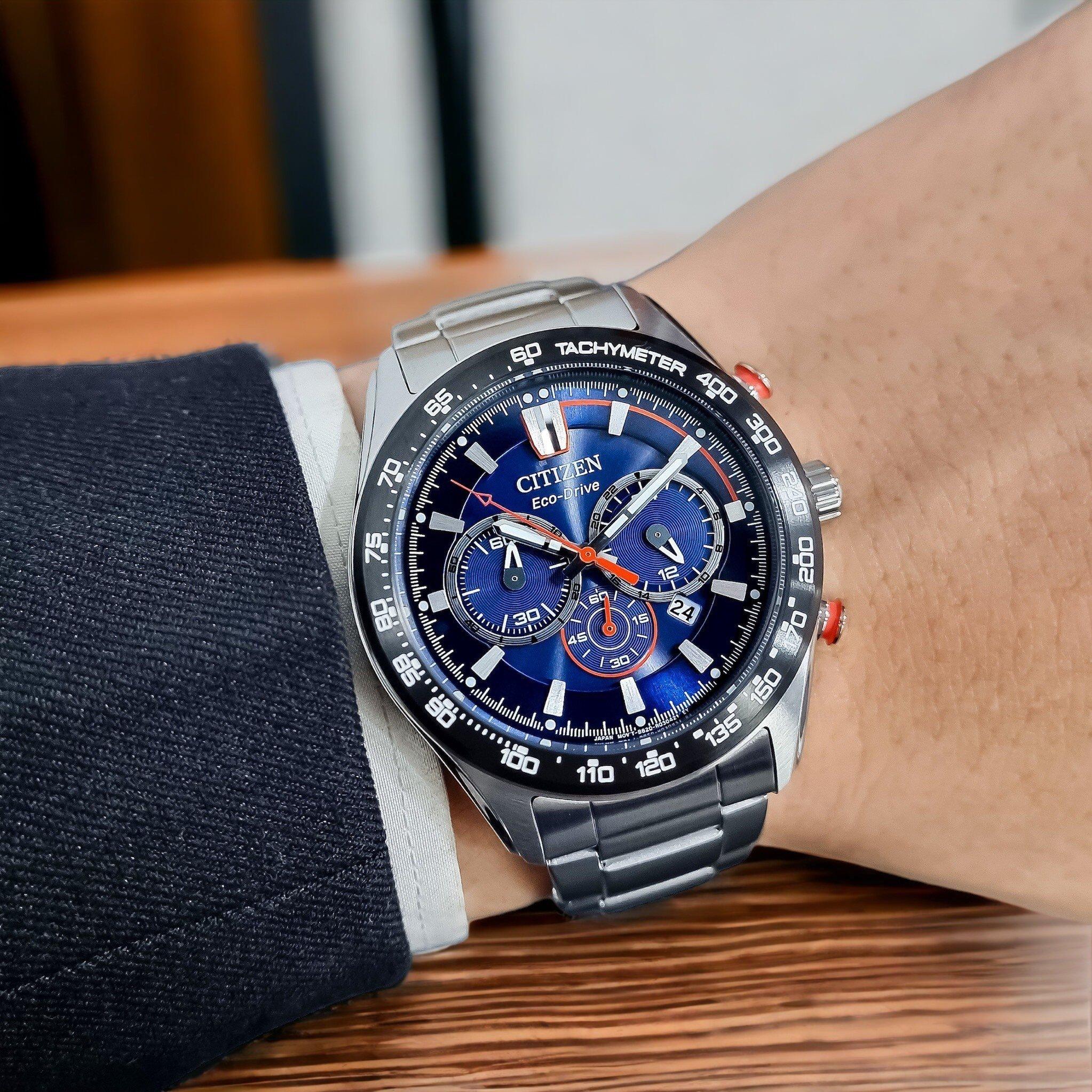 Мужские наручные часы Citizen Eco Drive CA4486-82L. Точный кварцевый механизм с аналоговой индикацией. Браслет из нержавеющей стали. Функция хронографа. Солнечная батарейка. Солнечная подзаряжающаяся батарейка обеспечивает питание часов для работы. Отображение времени возможно в 12-часовом или 24-часовом формате. Браслет из нержавеющей стали. Прочное, устойчивое к царапинам минеральное стекло защищает часы от повреждений. На циферблате отображается текущее число месяца. Часы являются водонепроницаемыми до 10 Бар. Цвет циферблата: Серебристый. Цвет циферблата: Черный. Цвет корпуса: Синий. На стрелки и отметки нанесен светонакопительный состав, благодаря этому считывать информацию с циферблата возможно и в темноте. Толщина: 12 мм. Гарантия: 2 года.