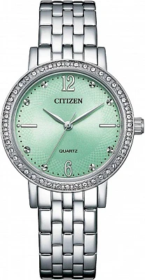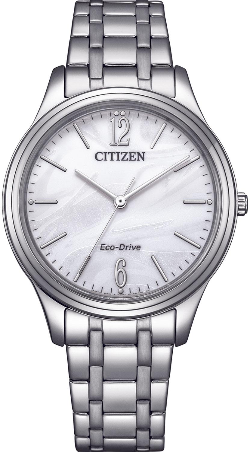 Женские кварцевые часы с технологией Eco-Drive работают на солнечной энергии и не требуют замены батареи. Модель с белым перламутровым циферблатом оснащена центральными часовой, минутной и секундной стрелками, а также серебристыми штрихами и арабскими цифрами на 12 и 6 часах. Круглый корпус из нержавеющей стали диаметром 34 мм и толщиной 7,3 мм дополнен стальным браслетом с раскладывающейся застежкой с кнопкой. Циферблат защищен минеральным стеклом, а водостойкость WR50 обеспечивает защиту от брызг и дождя.