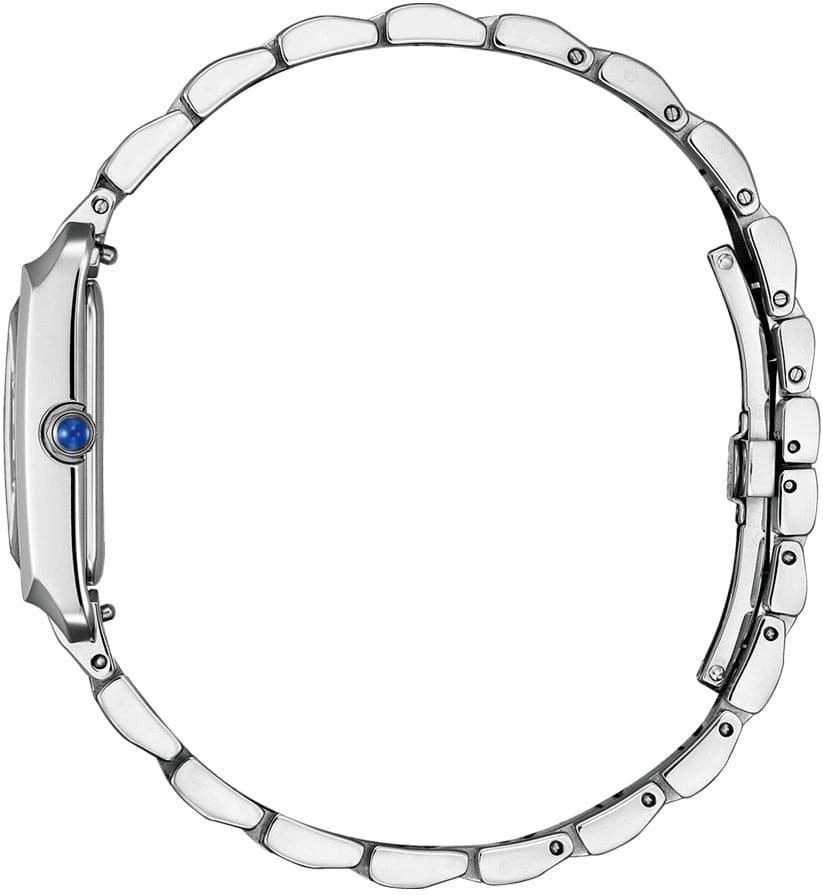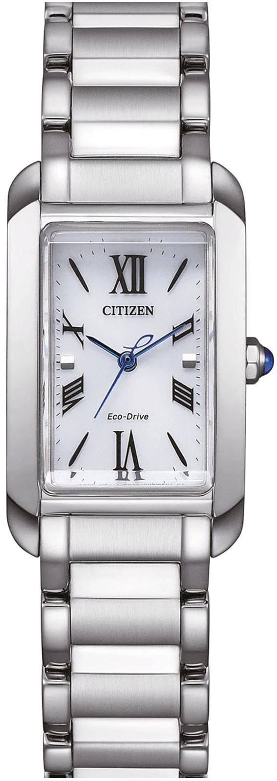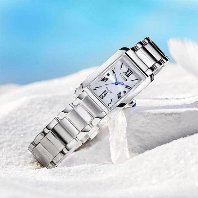 Изящные женские часы Citizen EW5620-55A с прямоугольным стальным корпусом (19?32,5?7 мм) сочетают японское качество и современный дизайн. Модель оснащена кварцевым механизмом, серебристым перламутровым циферблатом с римскими цифрами и изысканными синими стрелками. Элегантный браслет с застежкой-бабочкой дополняет образ, а сапфировое стекло и водозащита WR50 позволяют использовать часы во время плавания.