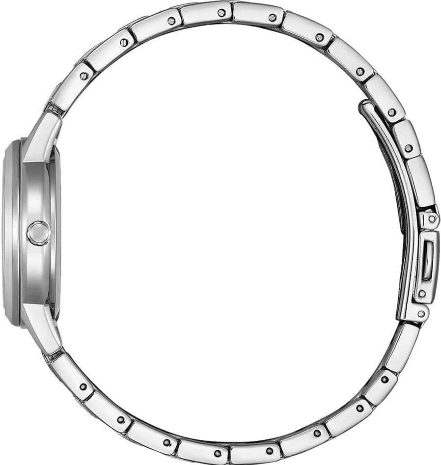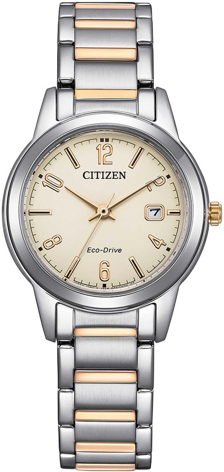 Эти женские кварцевые часы с солнечной батареей оснащены центральными часовой, минутной и секундной стрелками. Модель представлена на кремовом циферблате с комбинацией арабских цифр и штриховых меток. Круглый корпус из нержавеющей стали имеет двухцветное серебристо-золотистое покрытие, его диаметр составляет 29,4 мм, а толщина — 8,3 мм. Часы дополнены стальным браслетом с двухцветным покрытием и раскладывающейся застежкой с кнопкой. Циферблат защищен минеральным стеклом, а водостойкость WR30 обеспечивает защиту от брызг и дождя.