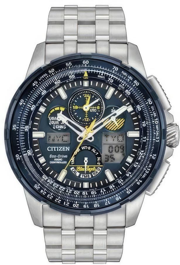 Мужские наручные часы Citizen Eco Drive JY8058-50L. Точный кварцевый механизм с аналого-цифровой индикацией. Корпус изготовлен из высококачественной нержавеющей стали 316L с высокими антикоррозийными свойствами. На стрелки и отметки нанесен светонакопительный состав, благодаря этому считывать информацию с циферблата возможно и в темноте. На циферблате отображается текущее число месяца и день недели. Солнечная батарейка. Солнечная подзаряжающаяся батарейка обеспечивает питание часов для работы. Радио-синхронизация. Часы будут получать радио-сигнал калибровки, гарантирующий, что они всегда будут показывать точное время. Часы созданы с защитой от воздействия магнитных полей. Функция хронографа. Функция таймера. Таймеры обратного отсчета напомнят Вам о текущих или особенных событиях, издав звуковой сигнал в установленное время. Индикатор запаса хода. Отображение времени возможно в 12-часовом или 24-часовом формате. Браслет из нержавеющей стали. Прочное, устойчивое к царапинам минеральное стекло защищает часы от повреждений. Часы являются водонепроницаемыми до 20 Бар. Цвет корпуса: Синий. Цвет циферблата: Синий. Ширина (с заводной головкой): 47мм. Толщина: 13мм. Гарантия: 2 года.