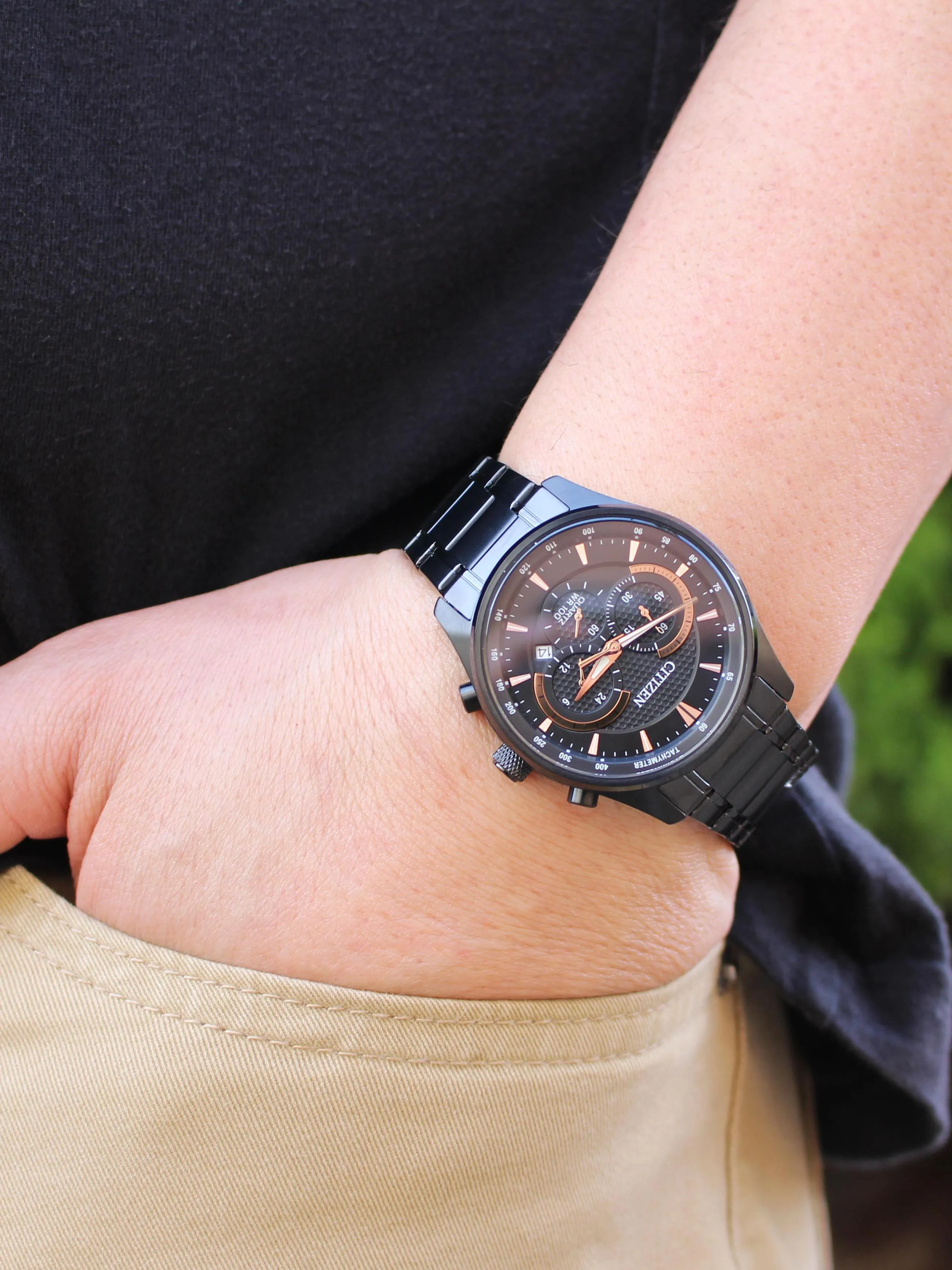 Мужские наручные часы Citizen Quartz AN8195-58E. Точный кварцевый механизм с аналоговой индикацией. Корпус изготовлен из высококачественной нержавеющей стали 316L с высокими антикоррозийными свойствами. На стрелки и отметки нанесен светонакопительный состав, благодаря этому считывать информацию с циферблата возможно и в темноте. На циферблате отображается текущее число месяца. Функция хронографа. Отображение времени возможно в 12-часовом или 24-часовом формате. Браслет из нержавеющей стали. Прочное, устойчивое к царапинам минеральное стекло защищает часы от повреждений. Часы являются водонепроницаемыми до 10 Бар. Цвет корпуса: Черный. Цвет циферблата: Черный. Ширина (с заводной головкой): 42мм. Толщина: 11мм. Гарантия: 2 года.