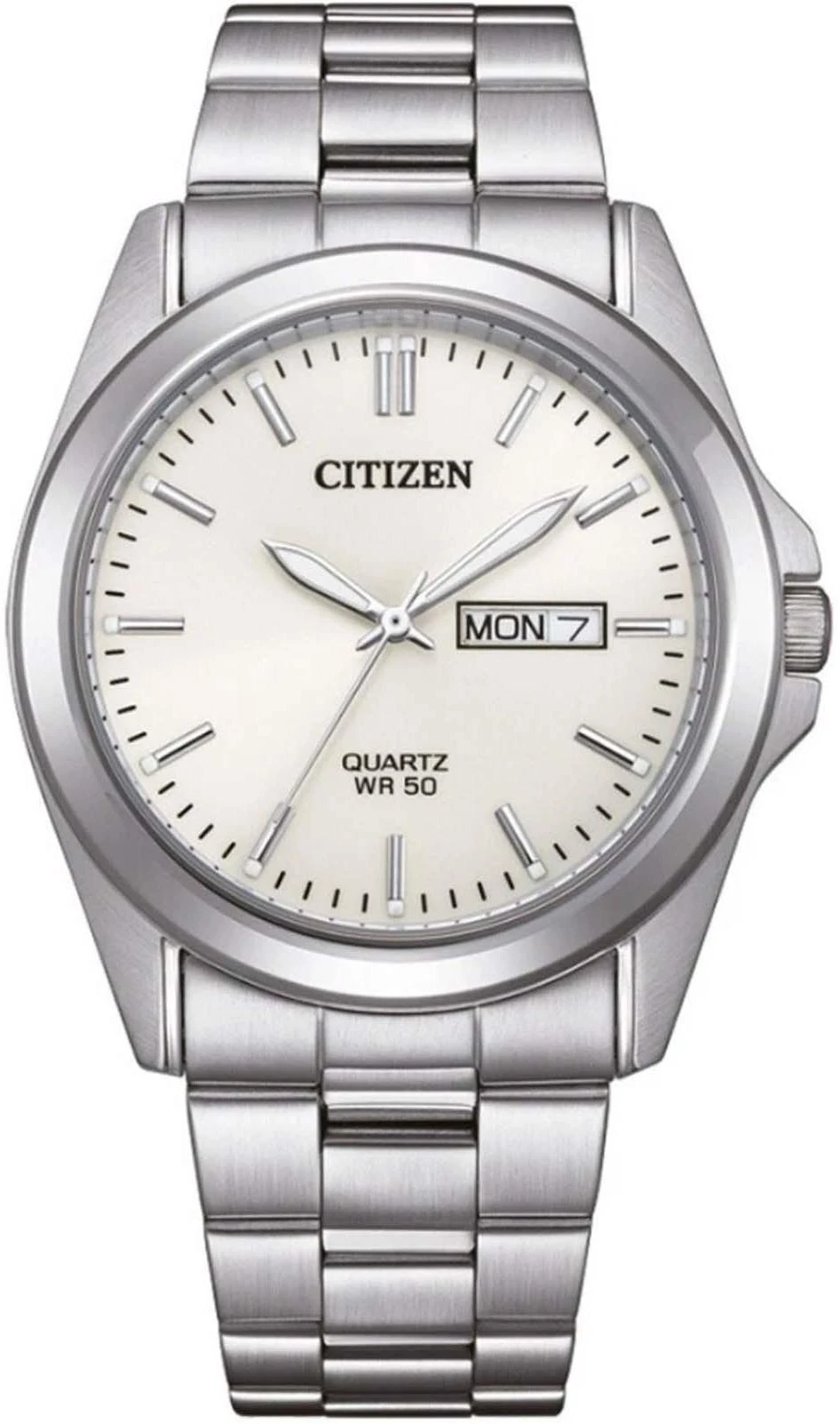 Мужские кварцевые часы Citizen BF0581-54A с японским механизмом представлены в круглом стальном корпусе диаметром 39,4 мм и толщиной 8 мм с серебристым покрытием. Модель с белым циферблатом оснащена центральными часовой, минутной и секундной стрелками, окошком даты на позиции 3 часа и аккуратными индексными метками. Стальной браслет дополнен минеральным стеклом, устойчивым к царапинам, а водонепроницаемость WR50 обеспечивает защиту от брызг и дождя.