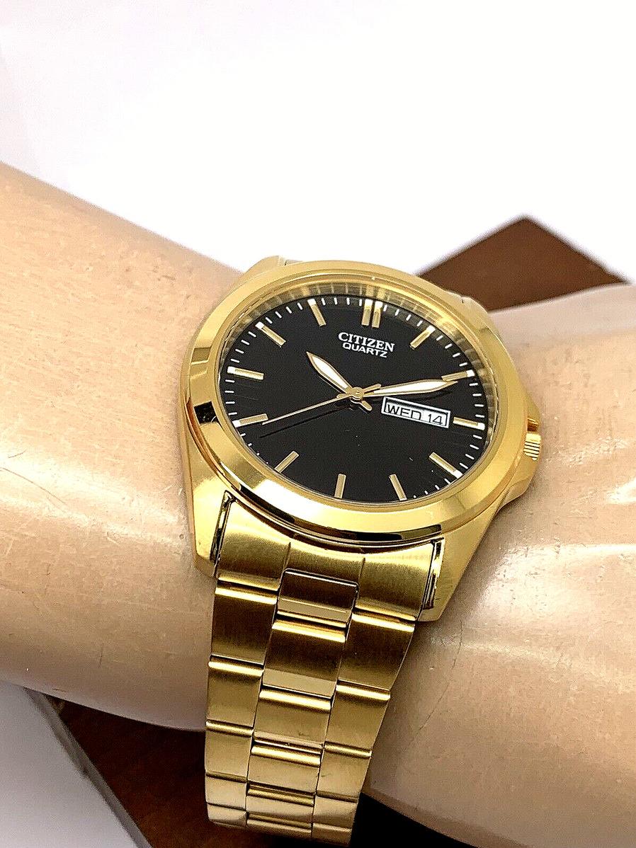 Мужские наручные часы Citizen Quartz BF0582-51F. Точный кварцевый механизм с аналоговой индикацией. Корпус изготовлен из высококачественной нержавеющей стали 316L с высокими антикоррозийными свойствами. На стрелки и отметки нанесен светонакопительный состав, благодаря этому считывать информацию с циферблата возможно и в темноте. На циферблате отображается текущее число месяца и день недели. Браслет из нержавеющей стали. Прочное, устойчивое к царапинам минеральное стекло защищает часы от повреждений. Часы являются водонепроницаемыми до 3 Бар. Цвет корпуса: Желтое золото. Цвет циферблата: Черный. Ширина (с заводной головкой): 38мм. Толщина: 9мм. Гарантия: 2 года.