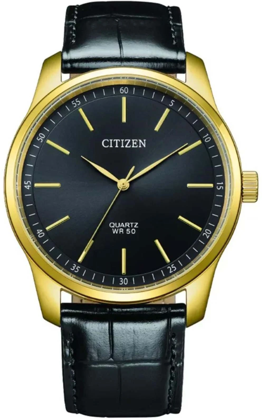 Мужские кварцевые часы с черным циферблатом и золотистыми стрелками и индексами оснащены центральными часовой, минутной и секундной стрелками, а также окошком даты на позиции 3 часа. Круглый корпус из нержавеющей стали с золотистым покрытием диаметром 42 мм и толщиной 9 мм дополнен черным кожаным ремешком с классической застежкой. Циферблат защищен устойчивым к царапинам минеральным стеклом, а водостойкость WR50 обеспечивает защиту от брызг и дождя.