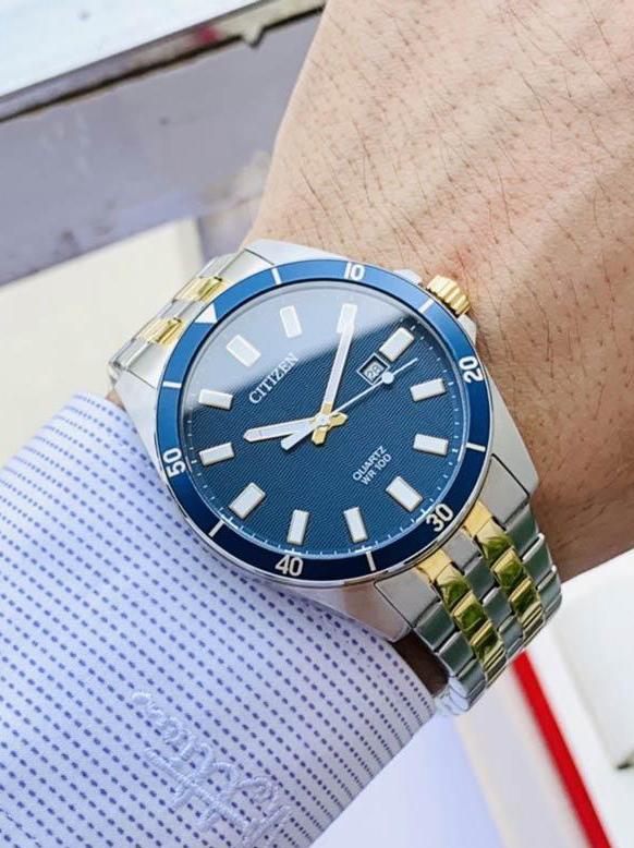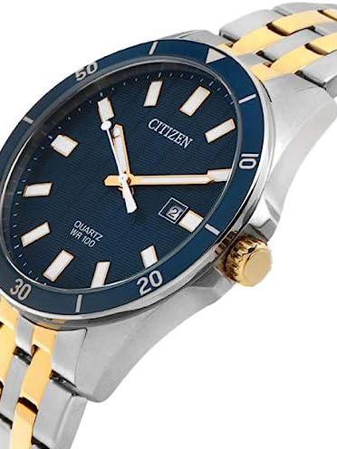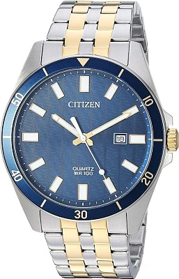 Мужские наручные часы Citizen Quartz BI5054-53L. Точный кварцевый механизм с аналоговой индикацией. Браслет из нержавеющей стали. Браслет из нержавеющей стали. Прочное, устойчивое к царапинам минеральное стекло защищает часы от повреждений. На циферблате отображается текущее число месяца. Часы являются водонепроницаемыми до 10 Бар. Цвет циферблата: Серебристый. Цвет циферблата: Синий. Цвет корпуса: Синий. На стрелки и отметки нанесен светонакопительный состав, благодаря этому считывать информацию с циферблата возможно и в темноте. Толщина: 9 мм. Гарантия: 2 года.