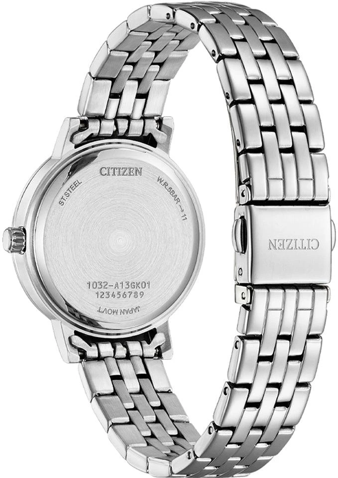 Кварцевые часы с водостойкостью WR 50 (защита от дождя и брызг при мытье рук) оснащены центральными часовой, минутной и секундной стрелками. Циферблат с комбинированными метками в виде штрихов и цифр украшен кристаллами. Стальной корпус диаметром 31 мм и стальной браслет дополнены устойчивым к царапинам минеральным стеклом.
