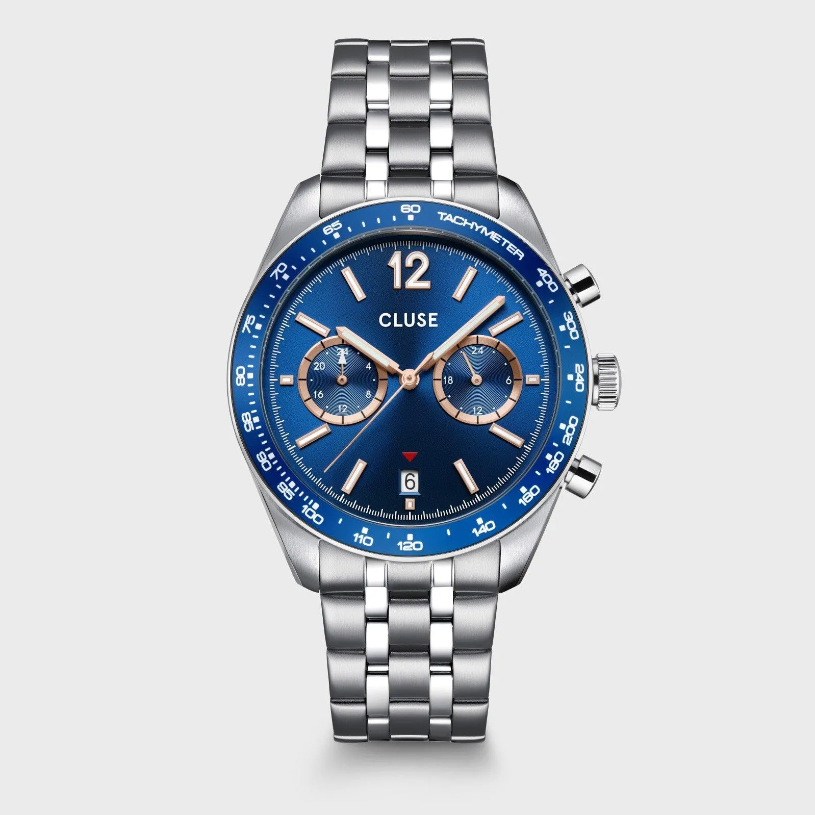 Круглые мужские часы Aravis Dual Timer имеют корпус серебристого цвета диаметром 40,5 мм, ремешок из нержавеющей стали шириной 20 мм, синий циферблат с тахиметрическим безелем и механизмом двойного времени с функцией индикации даты и возможностью отображения двух часовых поясов.