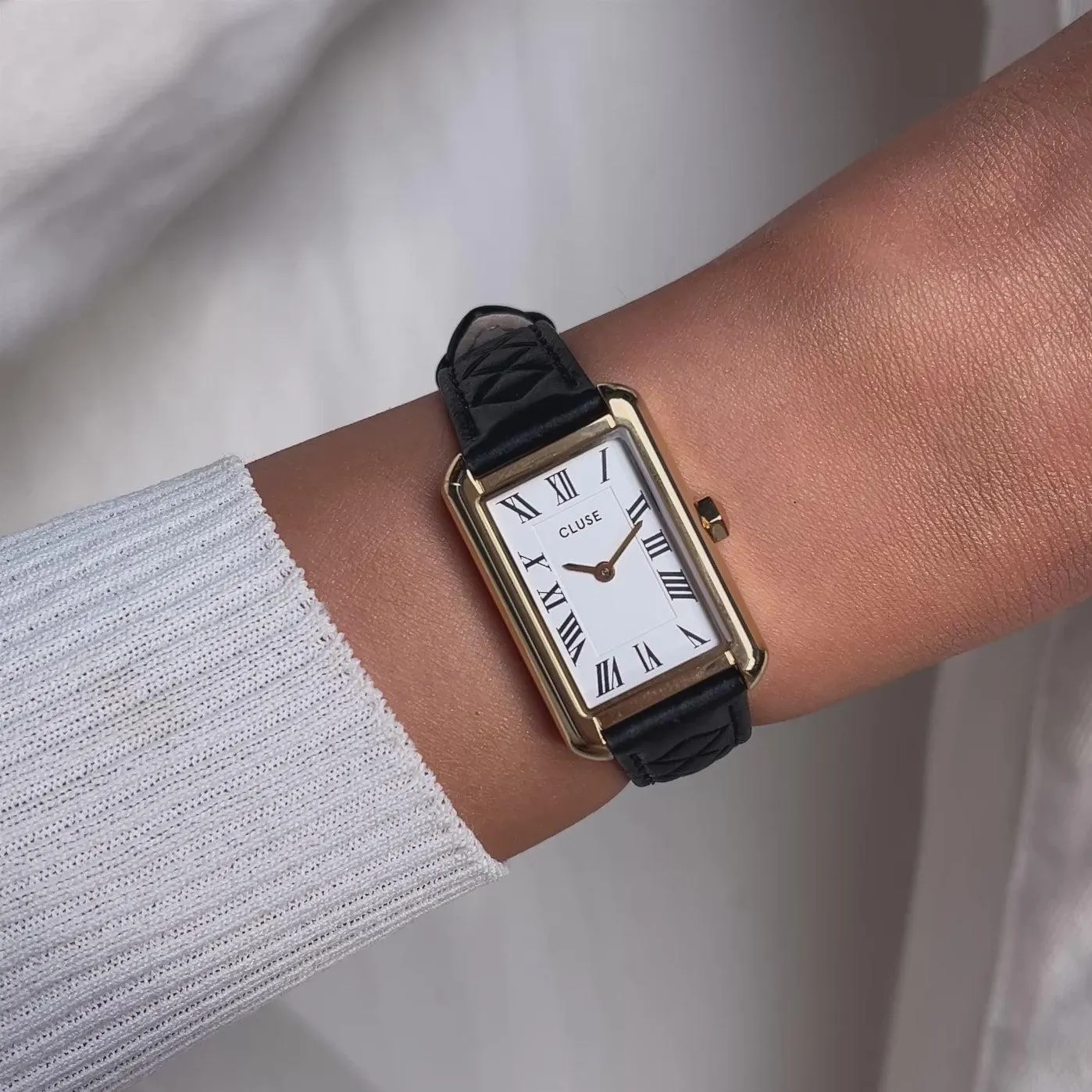 Женские часы Belisenna прямоугольной формы имеют корпус золотистого цвета диаметром 21 мм, белый циферблат и черный стеганый кожаный ремешок шириной 14 мм. Легко персонализируйте свои часы с помощью любого ремешка CLUSE шириной 14 мм.