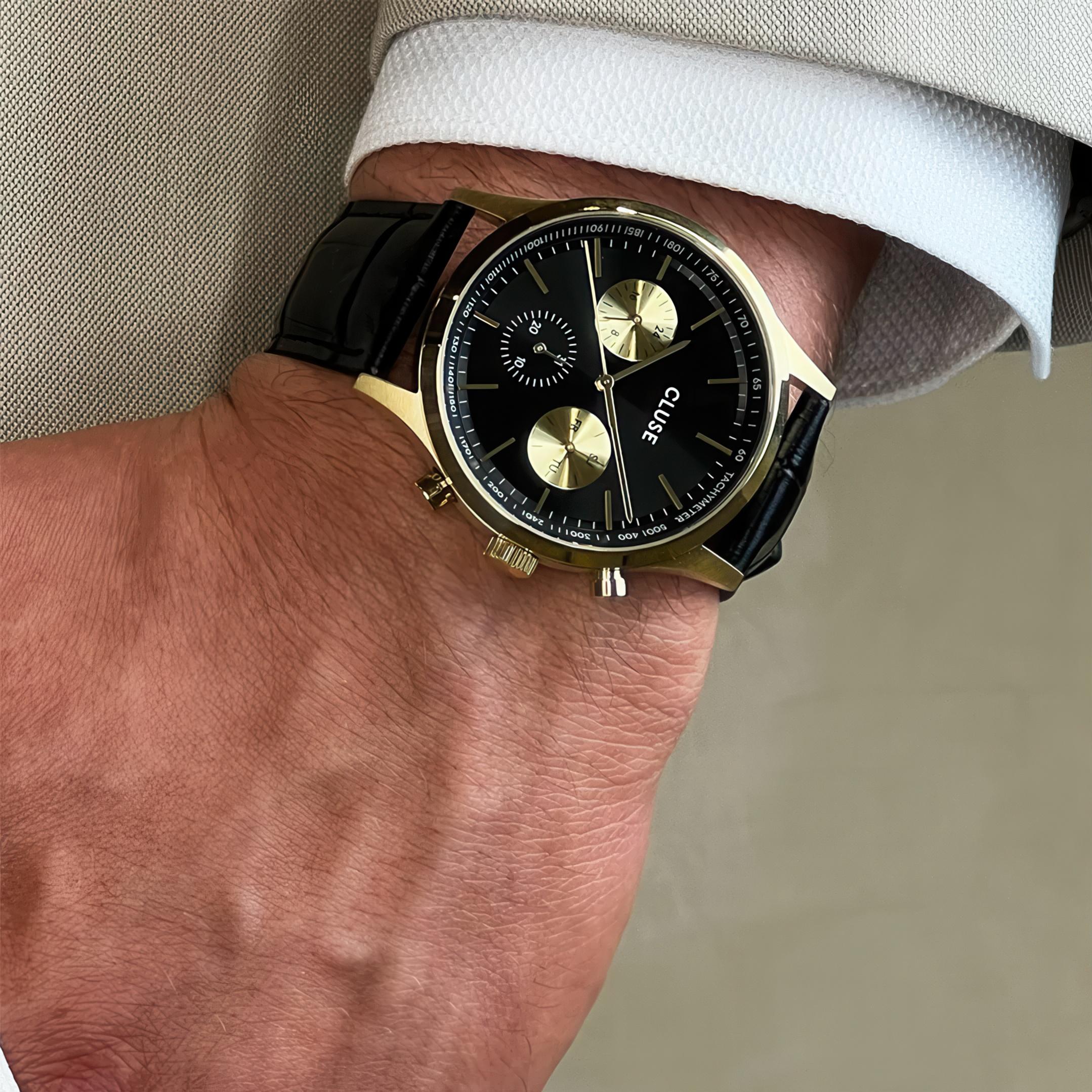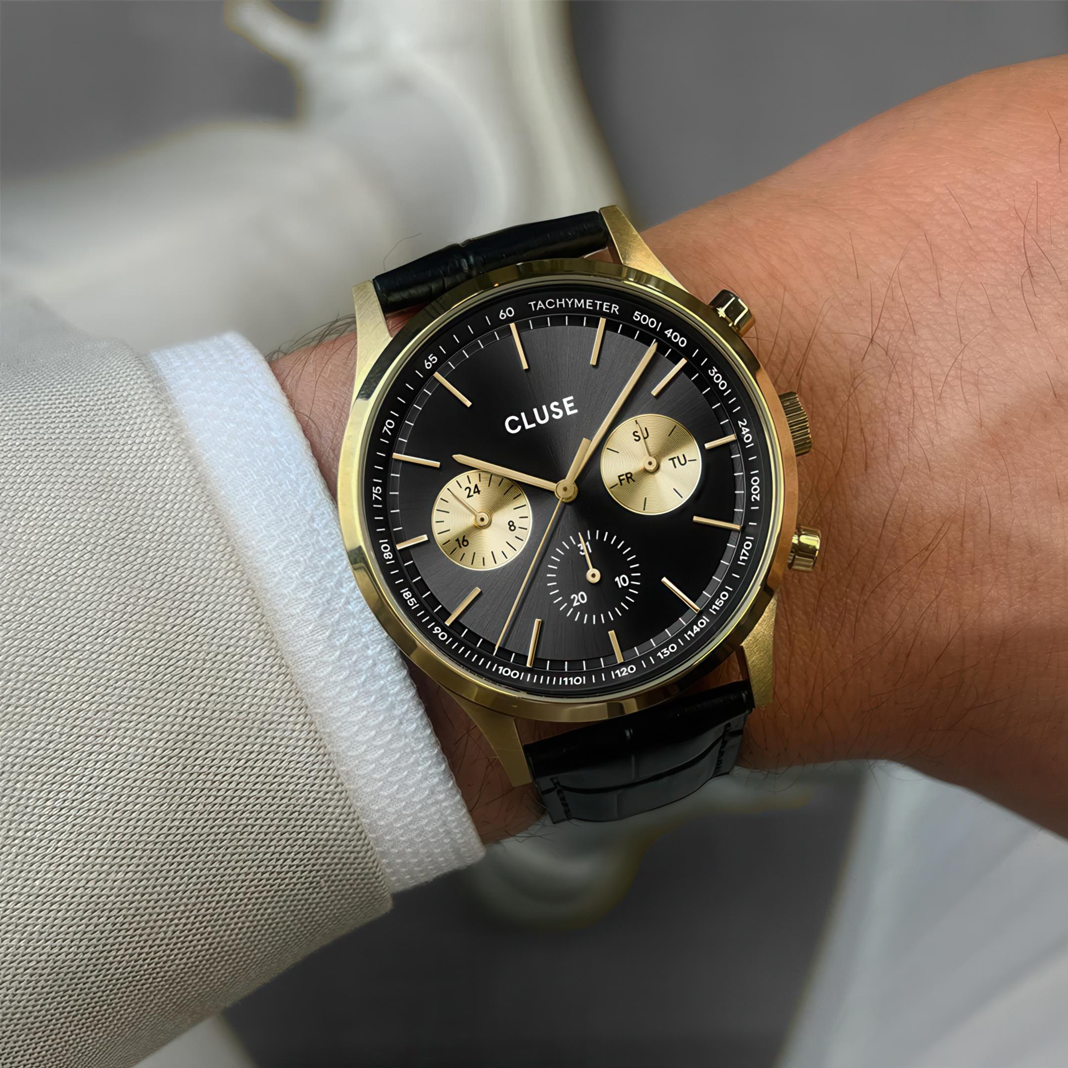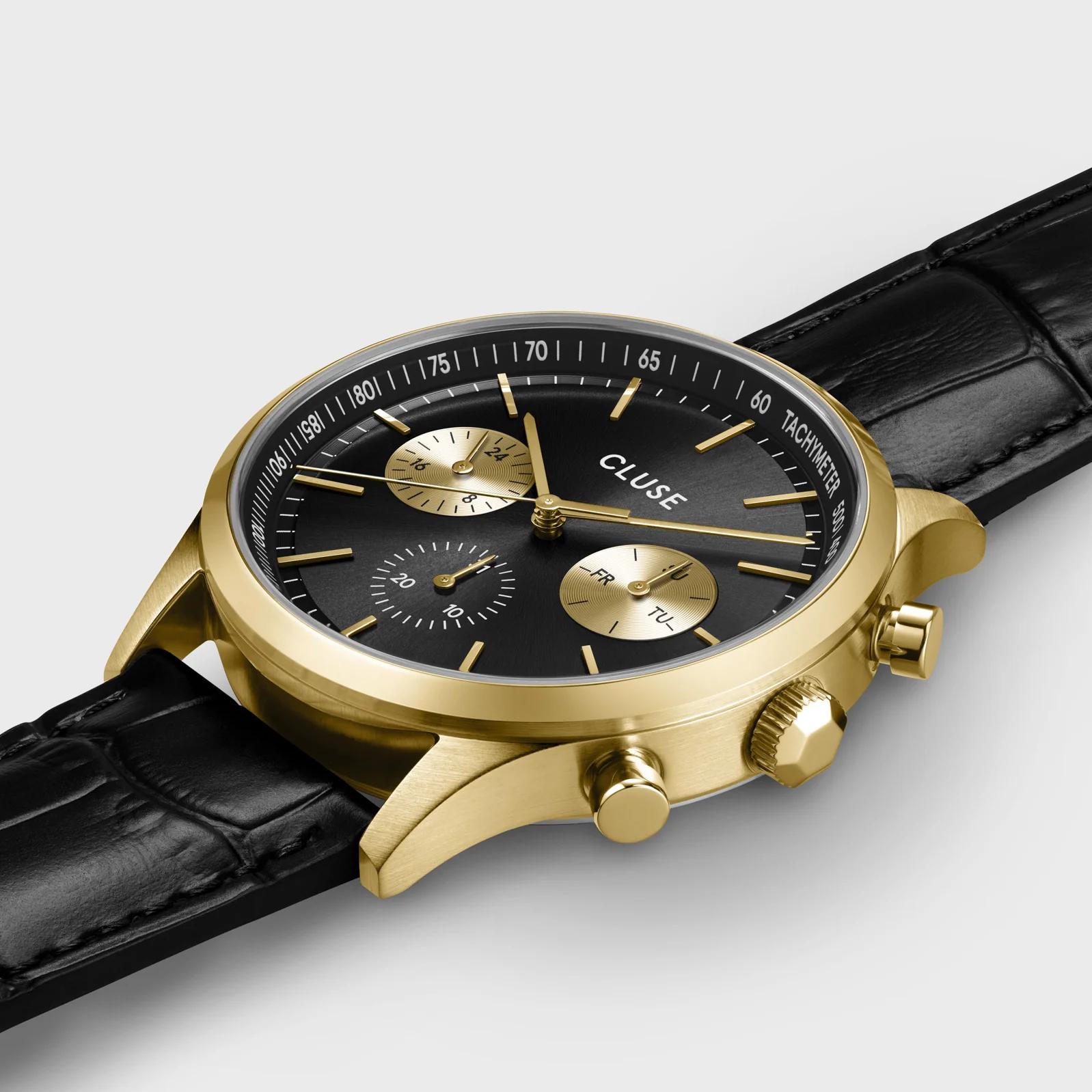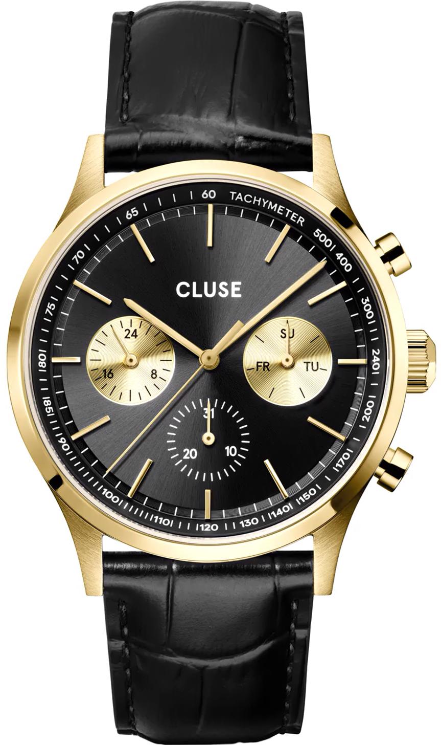 Мужские наручные часы Cluse Antheor CW21004. Точный кварцевый механизм с аналоговой индикацией. Ремешок изготовлен из кожи. Браслет из нержавеющей стали. Прочное, устойчивое к царапинам минеральное стекло защищает часы от повреждений. На циферблате отображается текущее число месяца и день недели. Часы являются водонепроницаемыми до 5 Бар. Цвет циферблата: Желтое золото. Цвет корпуса: Черный. Толщина: 10 мм. Гарантия: 2 года.
