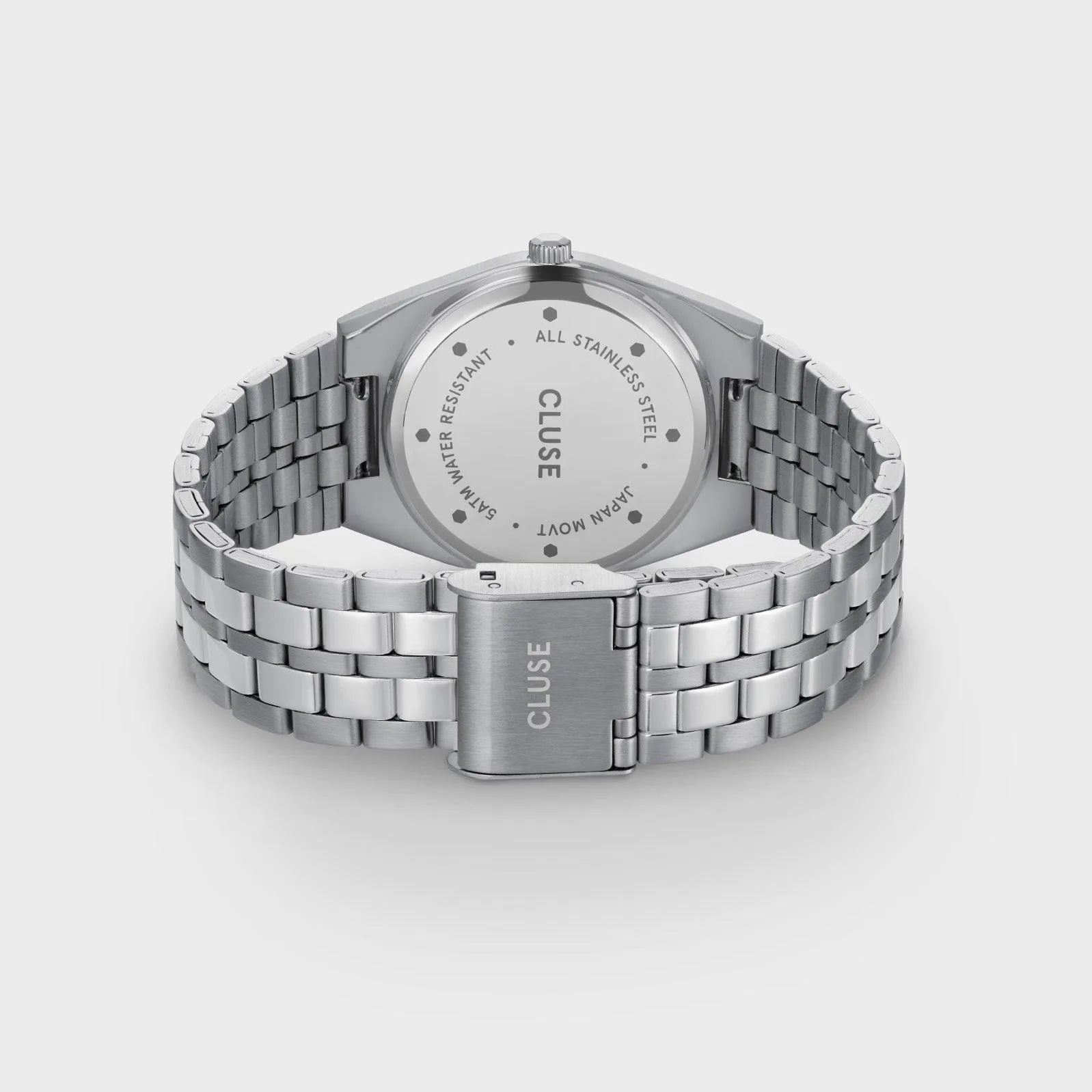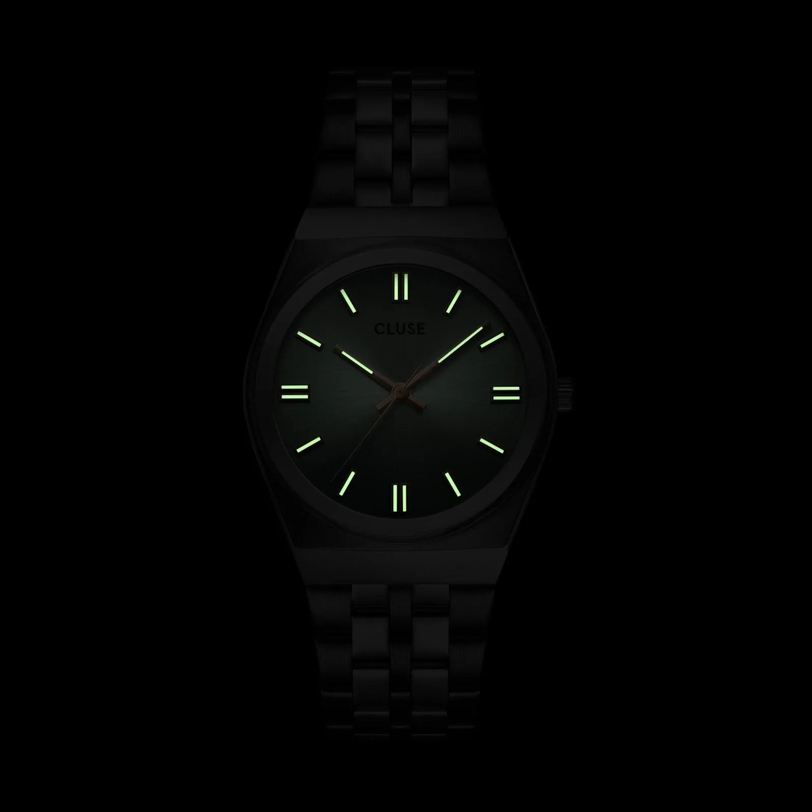 Круглые женские часы в стиле ретро 70-х годов имеют 33-миллиметровый корпус серебристого цвета, циферблат цвета шалфея в винтажном стиле со стрелками из розового золота и 20-миллиметровый серебристый ремешок из нержавеющей стали с пятью звеньями.