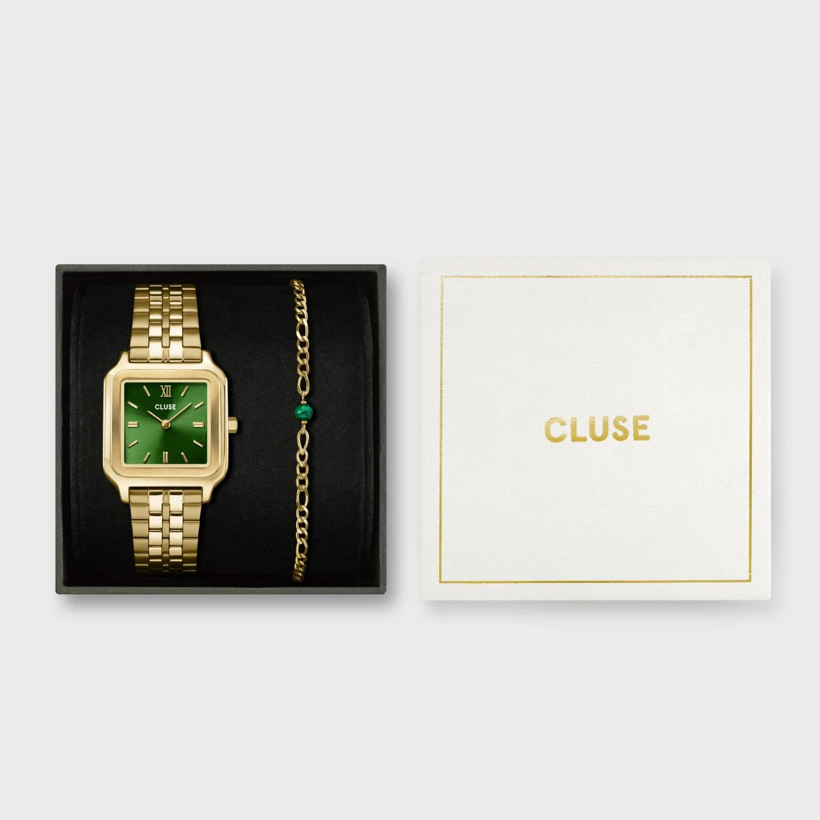 Часы Gracieuse имеют золотой корпус диаметром 28 мм, контрастный циферблат цвета лесного зелёного и 5-звеньевый ремешок шириной 16 мм, что делает их идеальными для любого случая. В сочетании с изящным браслетом золотого цвета с подвеской в ??виде малахита, изготовленным из высококачественной нержавеющей стали, это сочетание добавит вашему запястью изысканности. Подчеркните свой стиль с этим эксклюзивным дуэтом, который привлечёт внимание окружающих и станет поводом для разговоров, где бы вы ни находились.