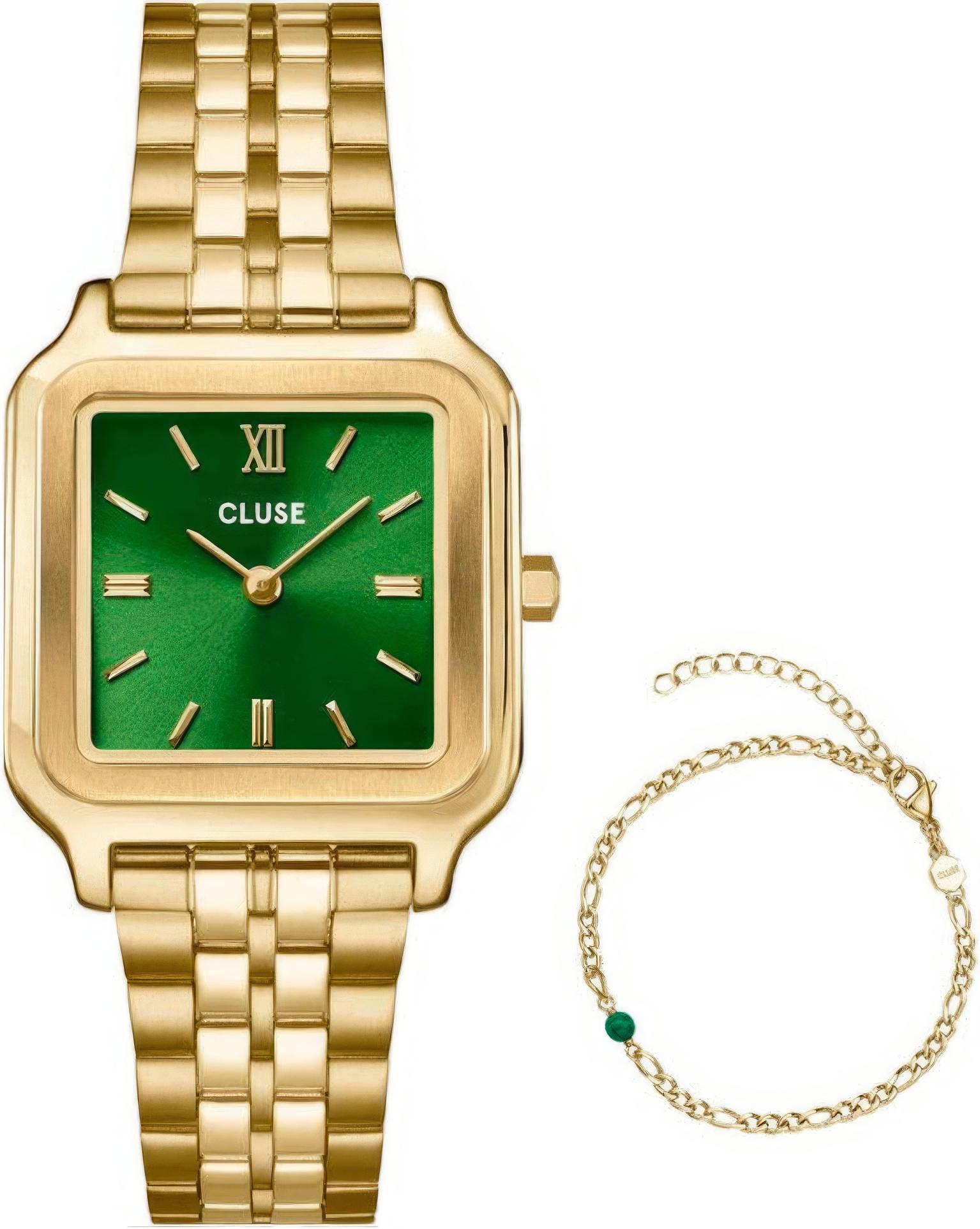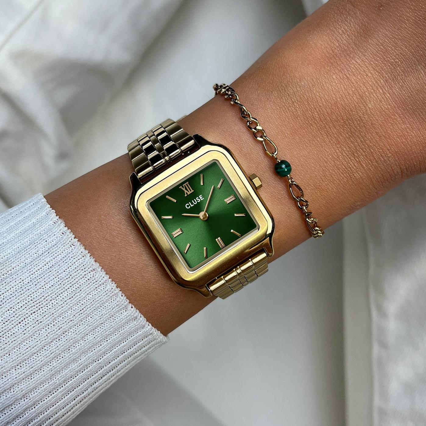 Часы Gracieuse имеют золотой корпус диаметром 28 мм, контрастный циферблат цвета лесного зелёного и 5-звеньевый ремешок шириной 16 мм, что делает их идеальными для любого случая. В сочетании с изящным браслетом золотого цвета с подвеской в виде малахита, изготовленным из высококачественной нержавеющей стали, это сочетание добавит вашему запястью изысканности. Подчеркните свой стиль с этим эксклюзивным дуэтом, который привлечёт внимание окружающих и станет поводом для разговоров, где бы вы ни находились.
