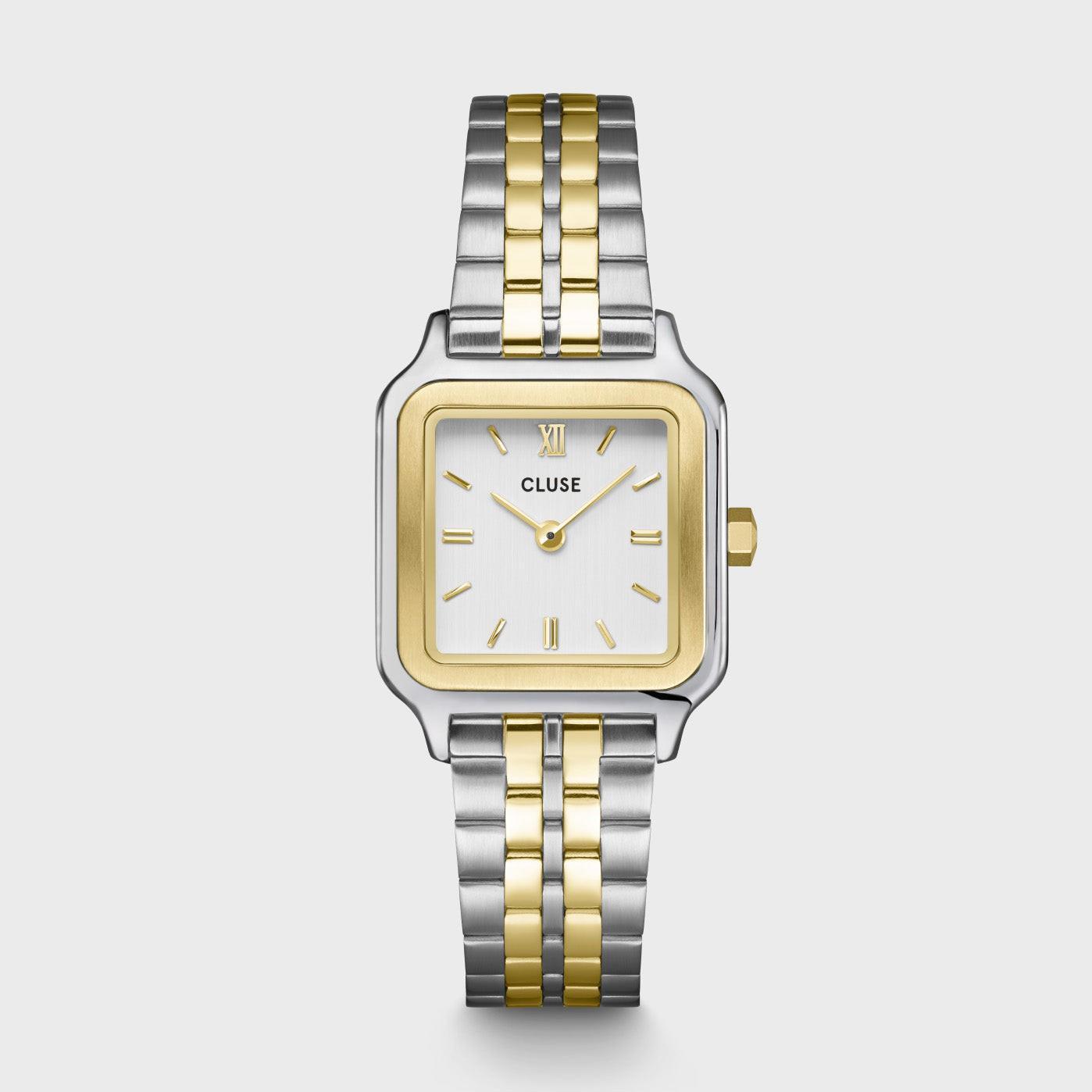 Женские часы Gracieuse Petite квадратной формы сочетают в себе золотые и серебристые элементы. Корпус диаметром 24 мм и браслет из нержавеющей стали выполнены в двухцветном дизайне. Модель дополнена классическим белым циферблатом и ремешком шириной 14 мм.